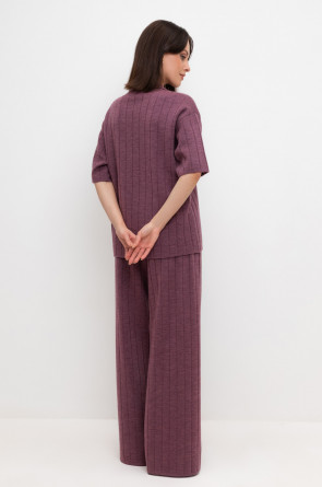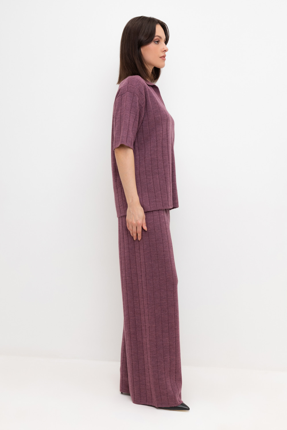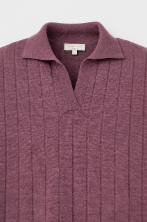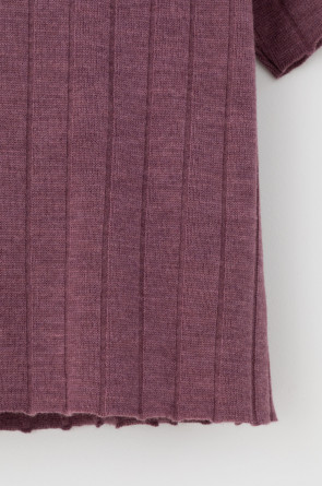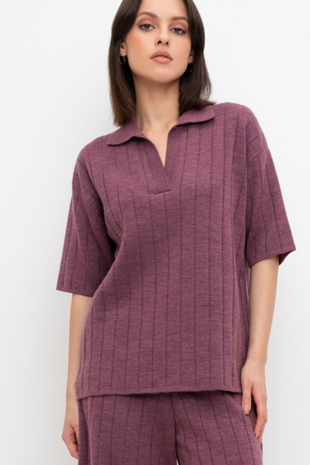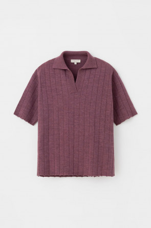 Поло свободного силуэта с короткими рукавами из полушерстяной пряжи. Спущенное плечо и прямой силуэт придают изделию свободный объем.