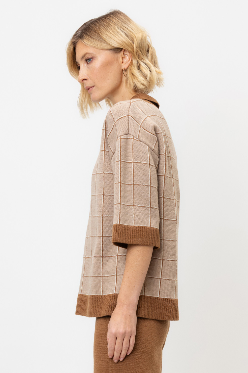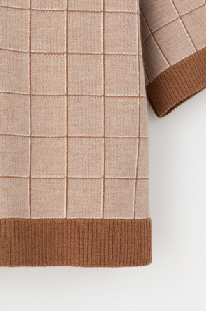 Поло свободного силуэта с короткими рукавами из полушерстяной пряжи. Связано жаккардом, манжеты и низ изделия хорошо держат форму благодаря вывязанной резинке. Спущенное плечо и прямой силуэт придают изделию свободный объем.