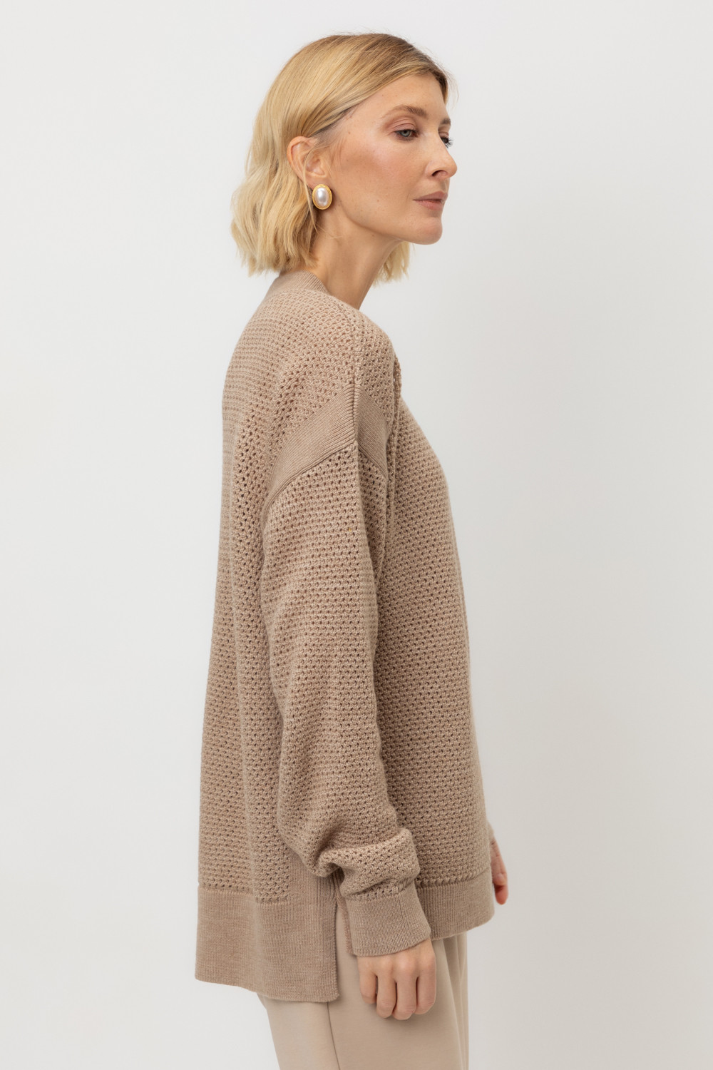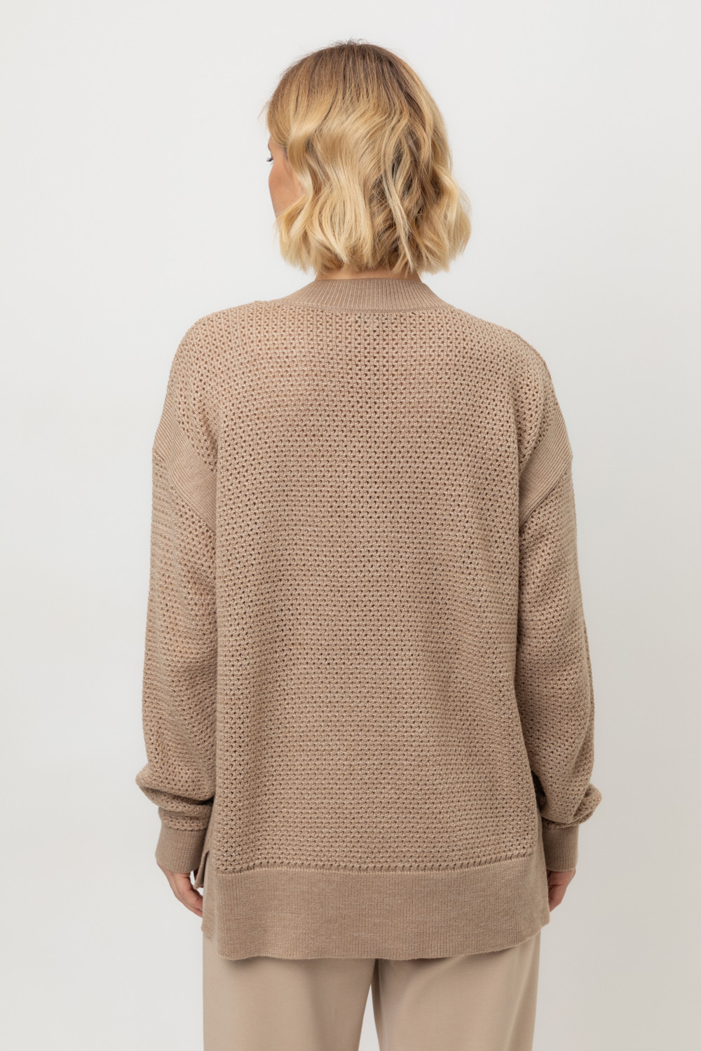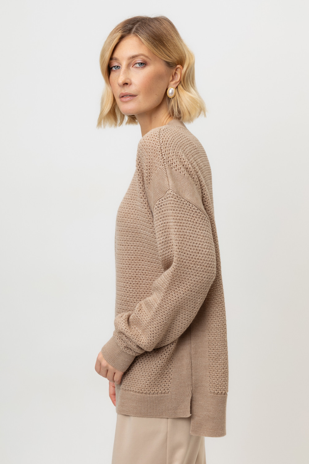 Вязаный джемпер из шерсти с добавлением акрила. Ажурная вязка, манжеты и нижний край не растянутся благодаря вывязанной резинке.