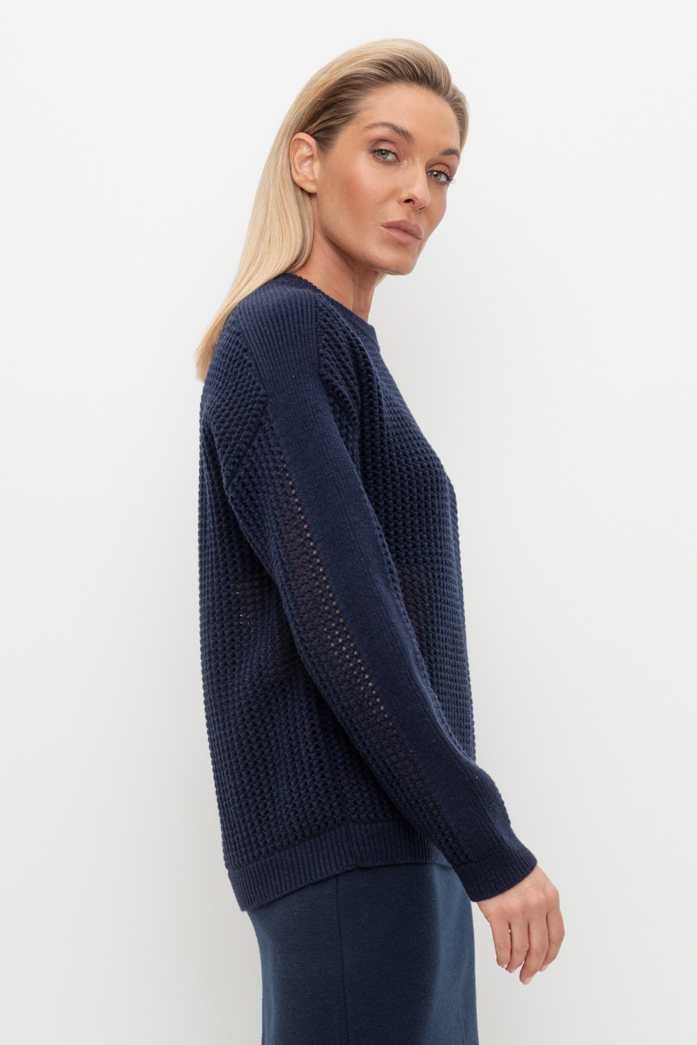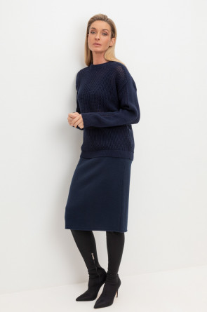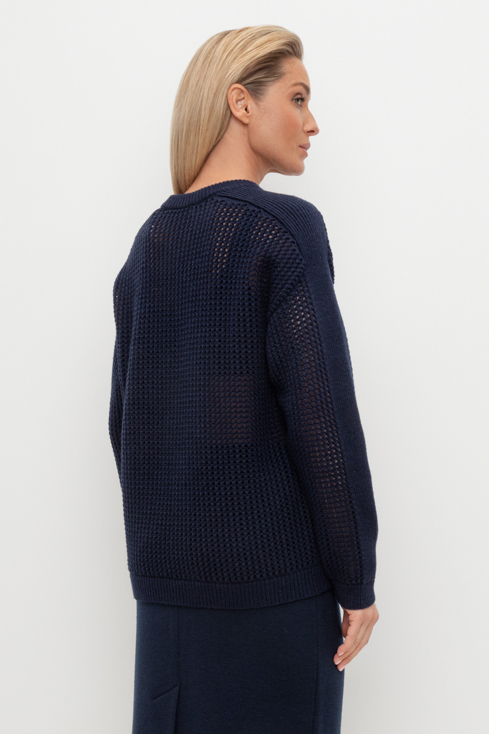 Выполнен из мягкой полушерстяной пряжи. Шерсть в составе сохраняет тепло, акрил делает изделие мягким. Прямой силуэт идеально подходит как к юбке, так и к брюкам.