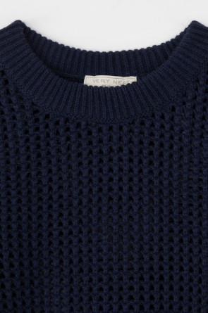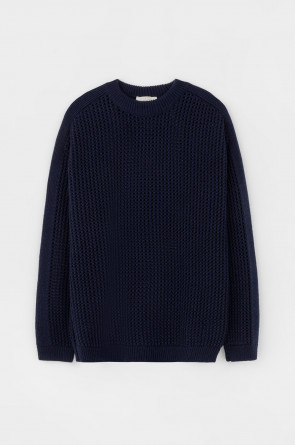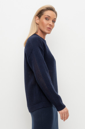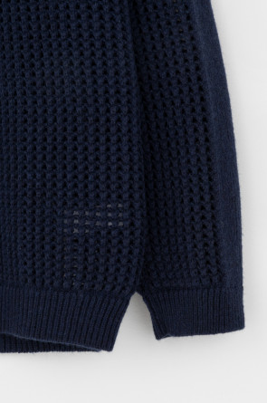 Вязаный джемпер из шерсти с добавлением акрила. Ажурная вязка, манжеты и нижний край не растянутся благодаря вывязанной резинке.
