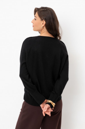 Уютный джемпер с V-образным вырезом. Выполнен гладью, манжеты, воротник и низ изделия связаны ластиком. В составе полушерстяная пряжа. Шерсть в составе приятно согревает, а благодаря волокнам акрила изделие мягкое и дольше сохраняет форму.