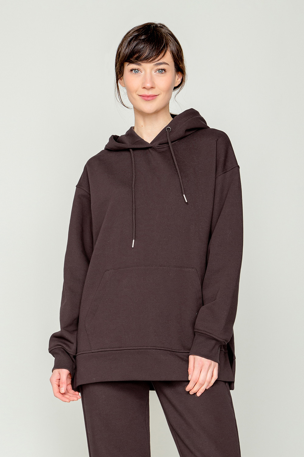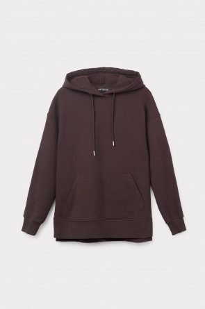 Трикотажная толстовка-оверсайз из петельчатого футера трехнитки. Капюшон регулируется с помощью шнура. У изделия свободная посадка, карман-кенгуру, эластичные манжеты. По бокам разрезы. Гладкий и плотный материал на основе хлопка сохраняет форму.