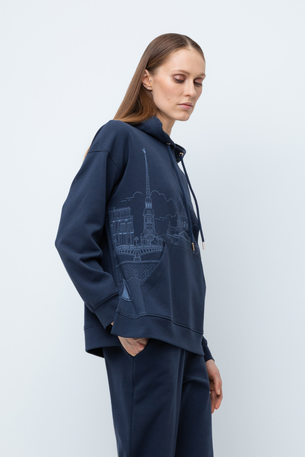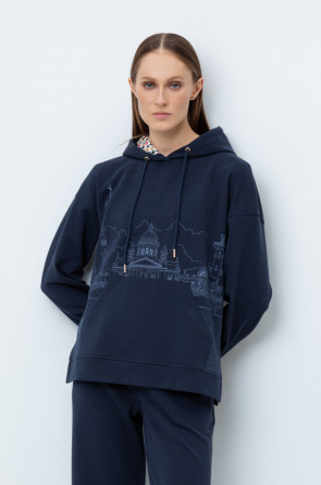 Женская толстовка-оверсайз из плотного гладкого трикотажа интерлок со спандексом. Капюшон регулируется с помощью шнура. У изделия свободная посадка, карман-кенгуру, манжеты. По бокам разрезы. Гладкий и плотный материал на основе хлопка сохраняет форму.