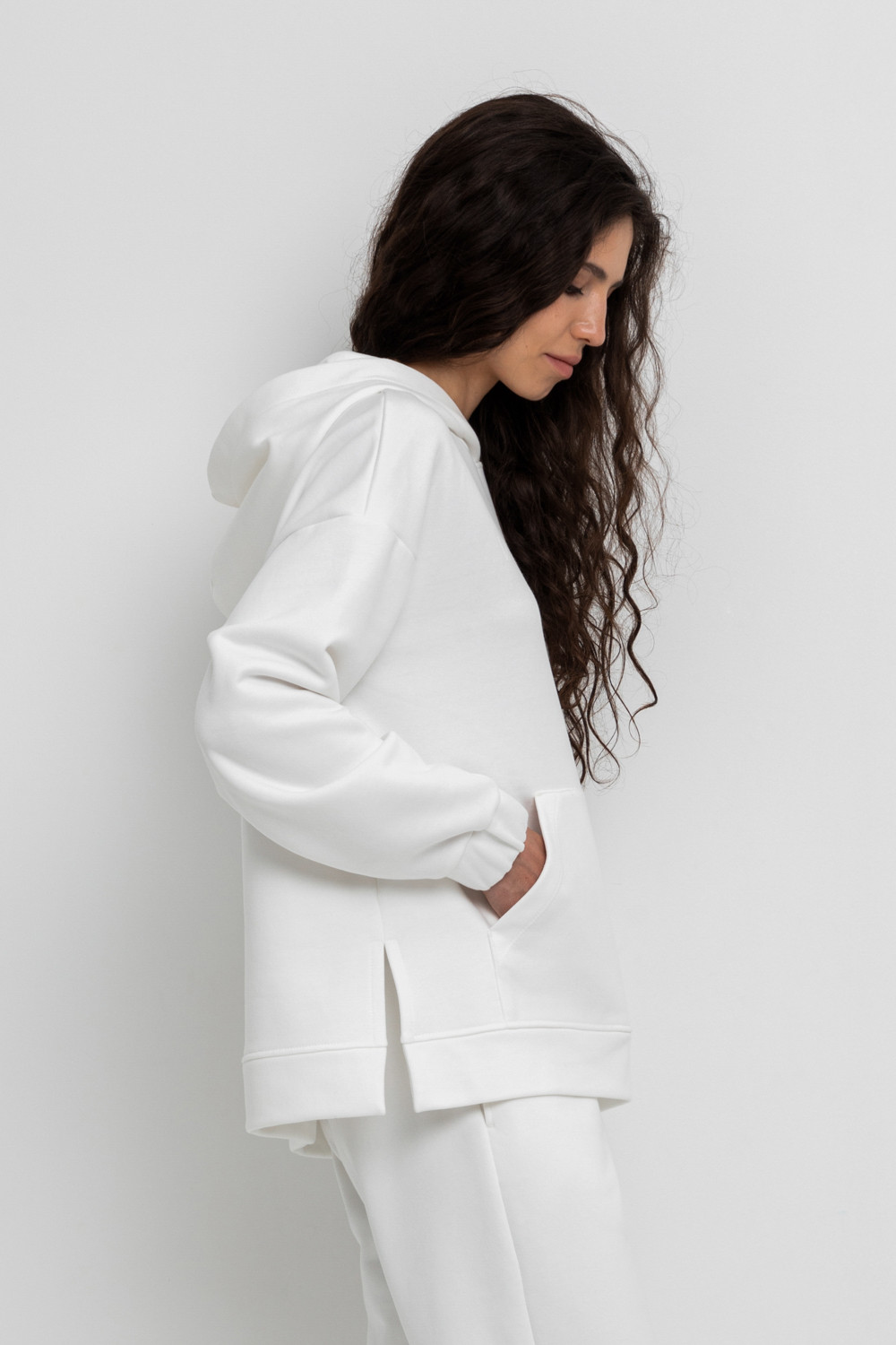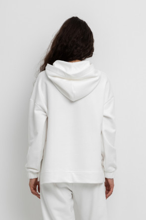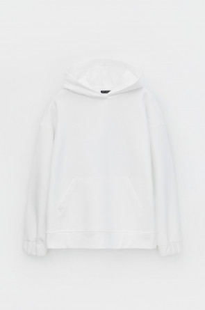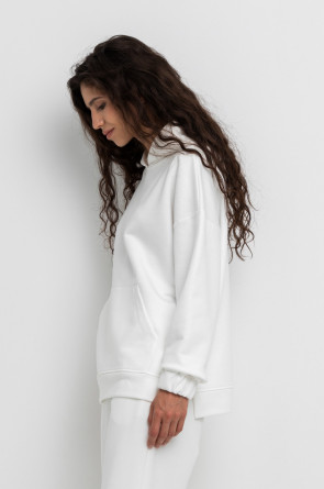 Теплая толстовка с капюшоном, карманом кенгуру и спущенным плечом из мягкого футера трехнитки. Уютный капюшон с подкладом из супрема. В боковых швах разрезы