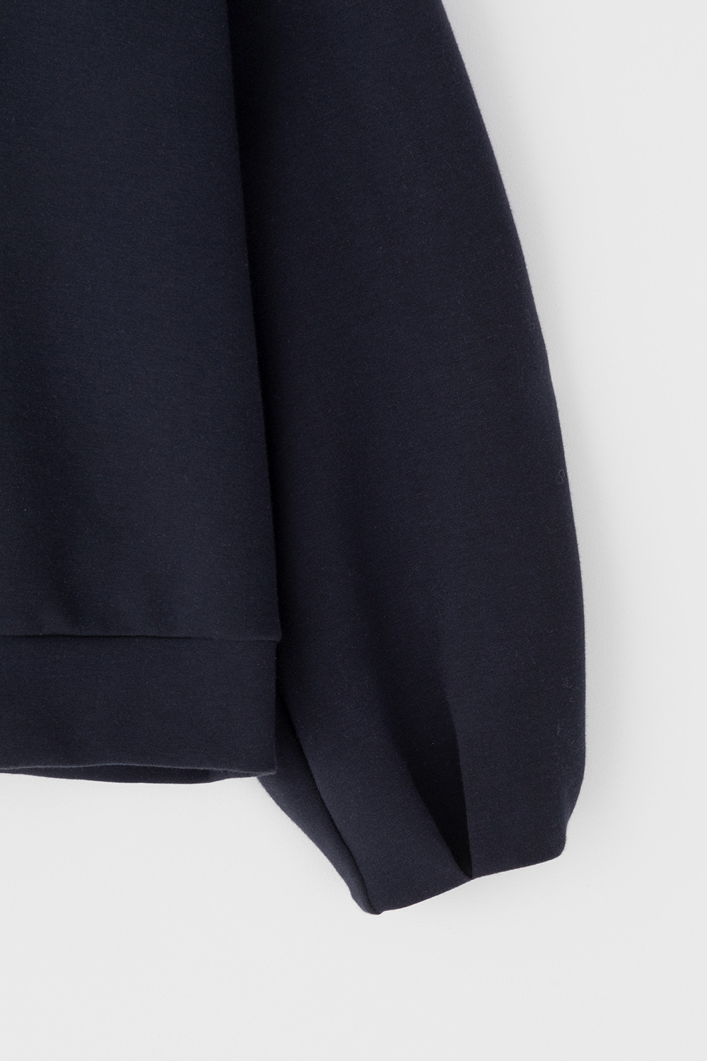Джемпер с объемными рукавами из плотного трикотажа интерлок. Спущенное плечо и прямой силуэт придают изделию свободный объем.