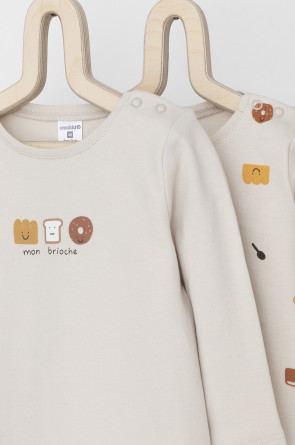 Джемперы в упаковке 2 шт для новорождённых из мягкого, эластичного трикотажа, произведённого из натурального хлопка. Изделие застёгивается на кнопки на плече. Оригинальные набивки выполнены из стойких, гипоаллергенных текстильных красителей. Все трикотажные полотна производятся в соответствии с нормами Швейцарского сертификата ЭкоТекс.