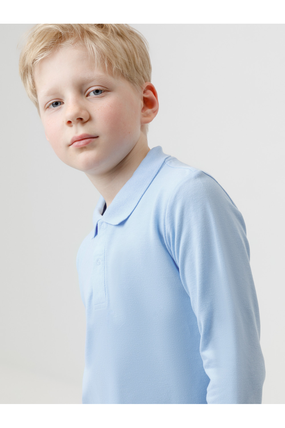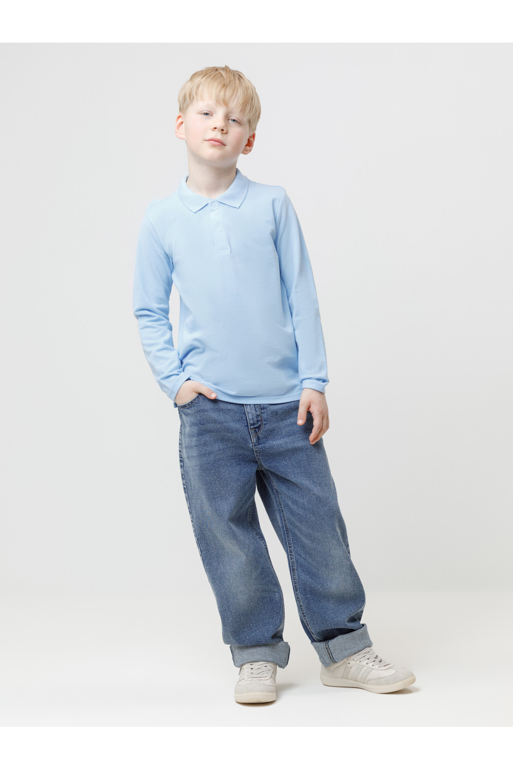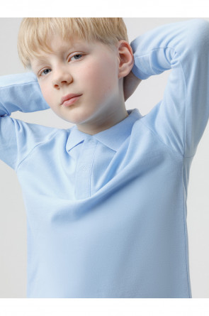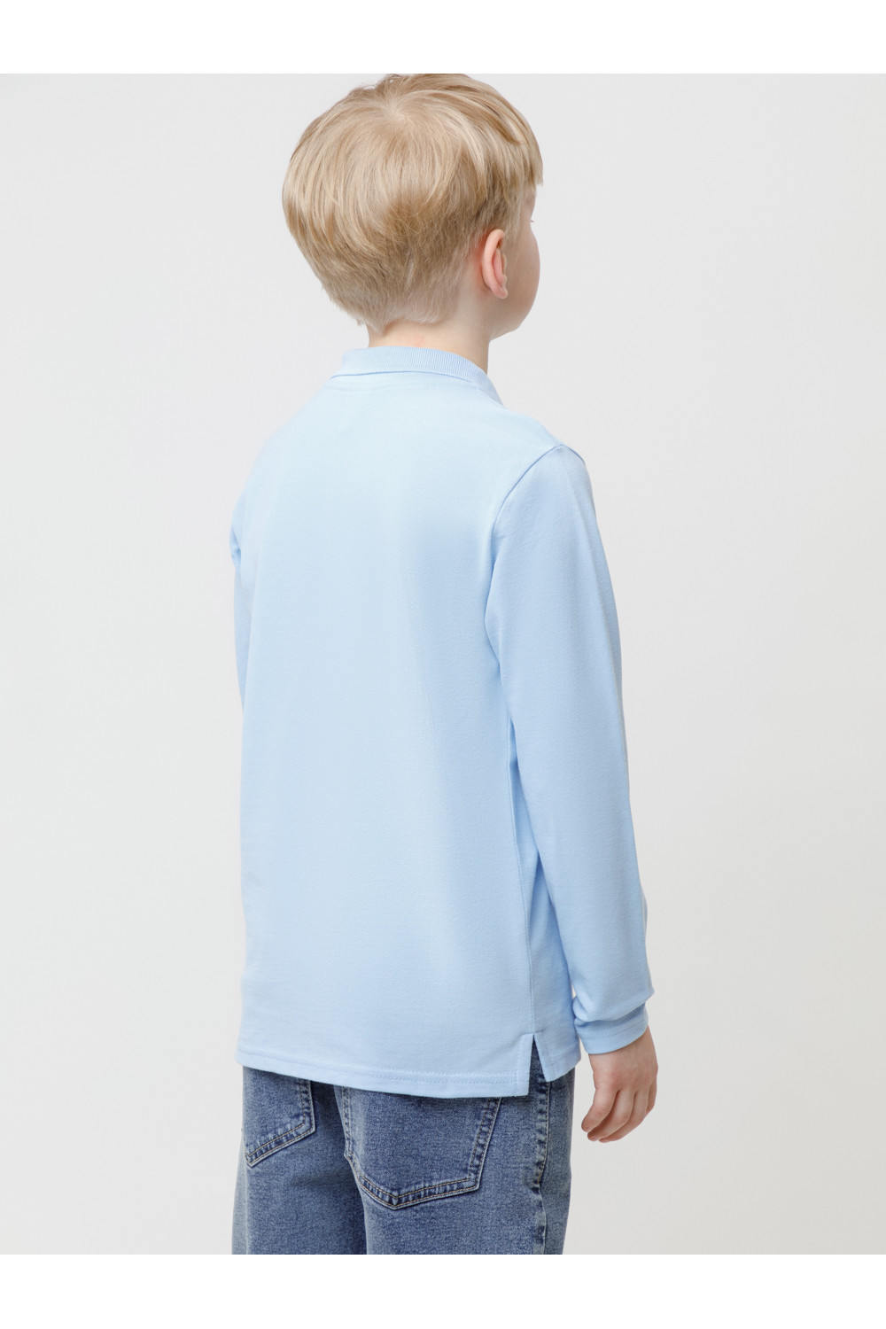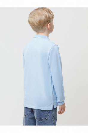 Джемпер поло с длинными рукавами для мальчика из трикотажного полотна пике. Вязаный воротник. Удобная застежка спереди. По бокам разрезы, обработанные киперной лентой.