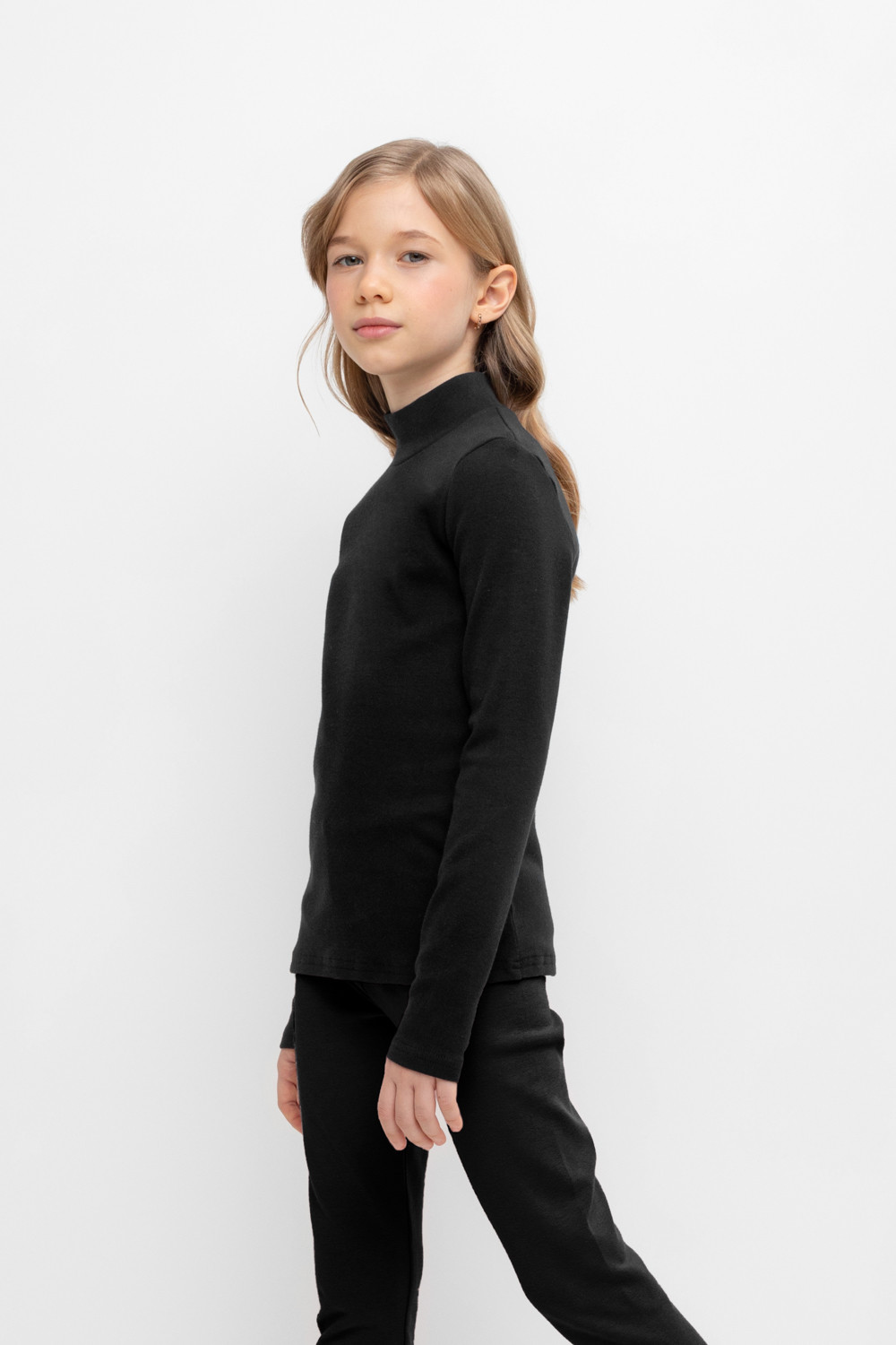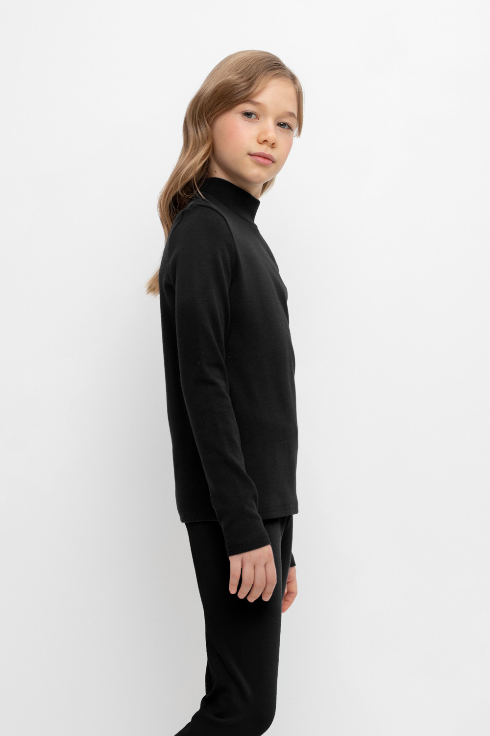 Однотонная водолазка с высоким воротником-стойкой и длинными рукавами. Выполнена из высококачественной эластичной рибаны с начёсом. Эластан в составе позволяет изделию быть более эластичным и дольше сохранять опрятный внешний вид. Воротник защищает горло от прохладного воздуха.