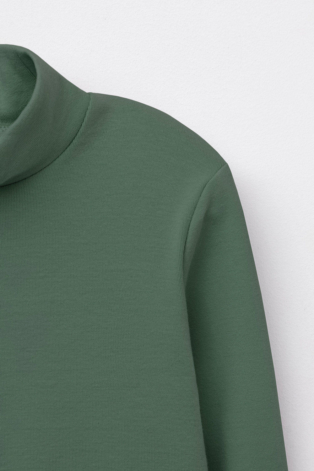 Однотонная водолазка с высоким воротником-стойкой и длинными рукавами. Выполнена из высококачественной эластичной рибаны с начёсом. Эластан в составе позволяет изделию быть более эластичным и дольше сохранять форму. Воротник защищает горло от прохладного воздуха.