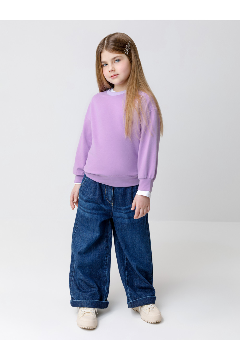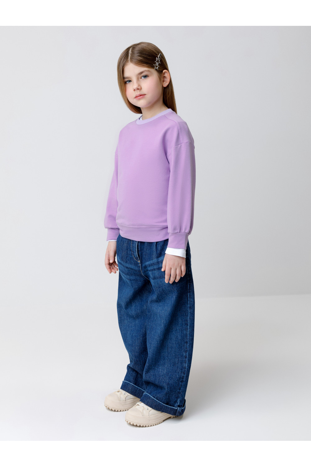 Джемпер для девочки из высококачественного петельчатого футера с эластаном. Обтачка горловины выполнена из эластичного полотна.