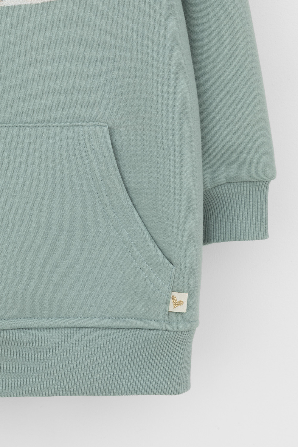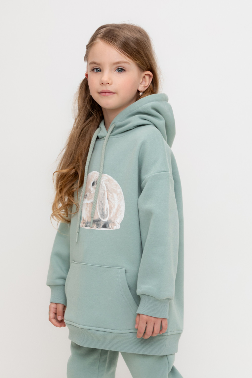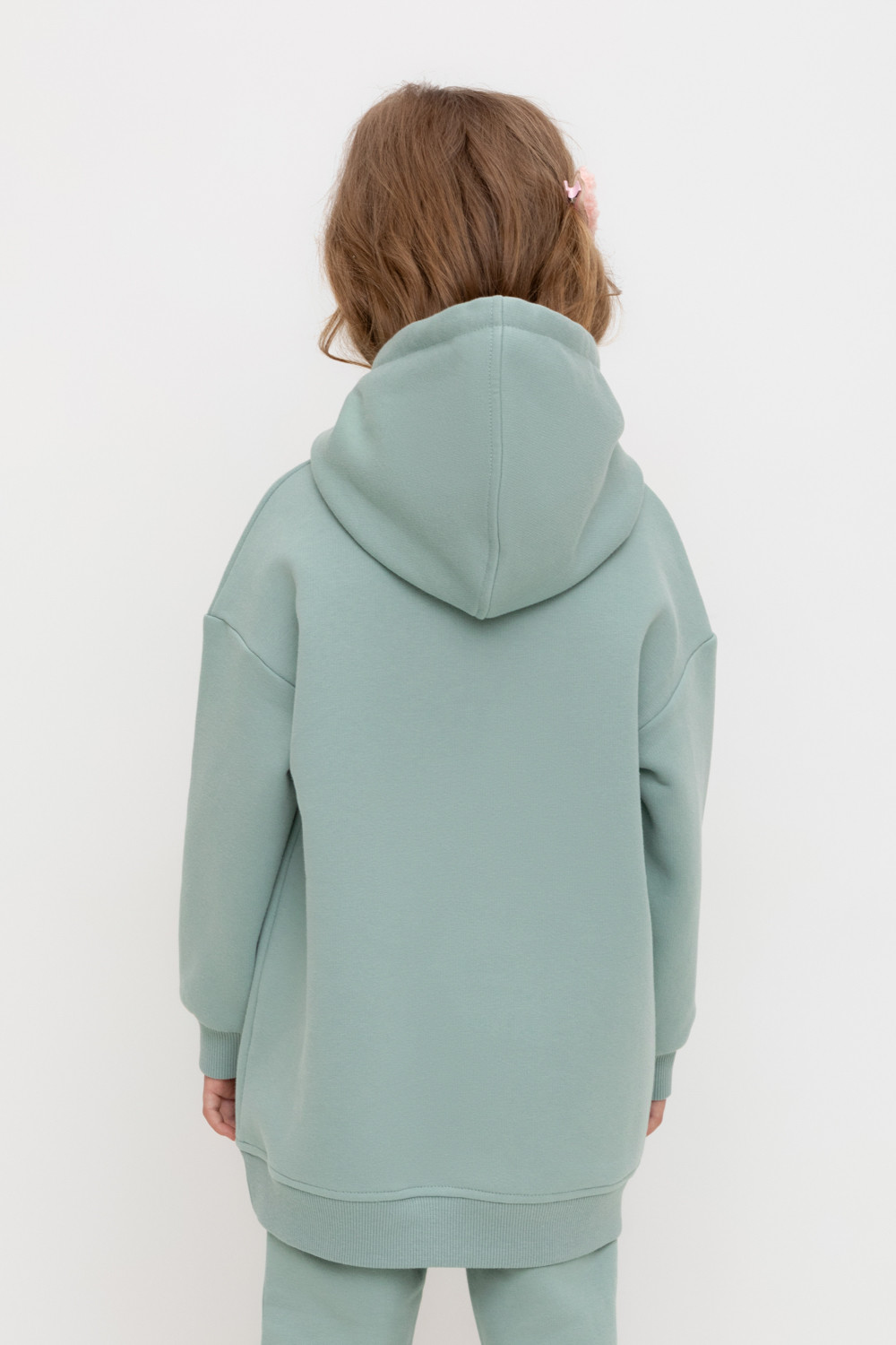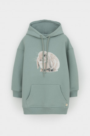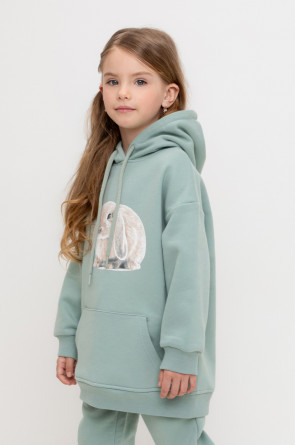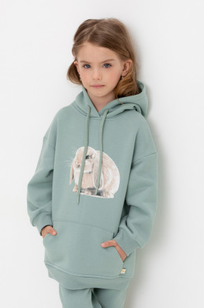 Худи с капюшоном и принтом для девочки из футера трехнитки с начесом. Манжеты и пояс выполнены из эластичного полотна. Спереди удобный карман-кенгуру.