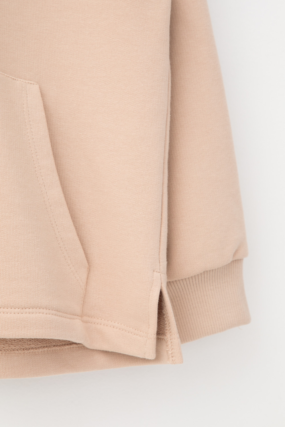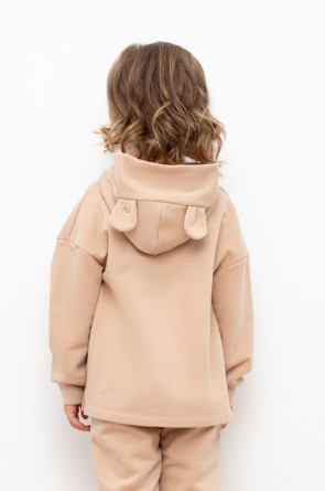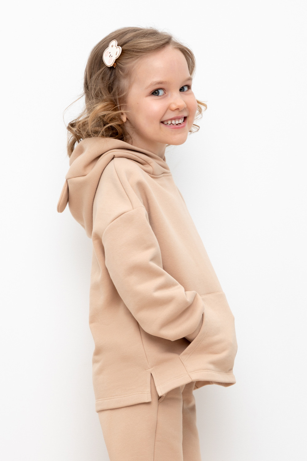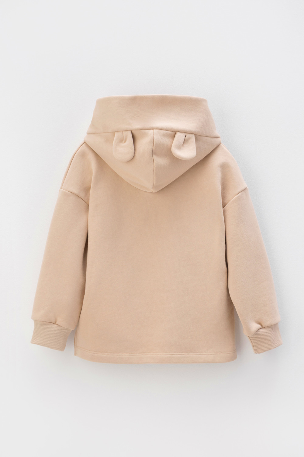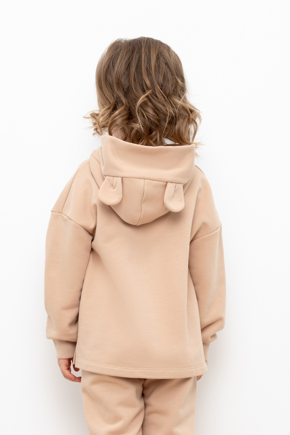 Толстовка с капюшоном и декоративными ушками для девочки из футера с начесом. В составе 80% натурального хлопка и 20% полиэстера, при этом полиэстер ввязан внутрь по особой технологии и не соприкасается с кожей. Манжеты и пояс из эластичного трикотажа.