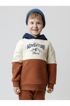 Худи с капюшоном для мальчика из тёплого футера с начёсом. Пояс и манжеты выполнены из мягкого эластичного трикотажа. Спереди удобный и вместительный карман-кенгуру. Худи сохраняет форму и стойкий цвет после многочисленных стирок и идеально подходит на каждый день. Оригинальный принт выполнен из стойких текстильных гипоаллергенных красителей. Все трикотажные полотна производятся в соответствии с нормами швейцарского сертификата ЭкоТекс.