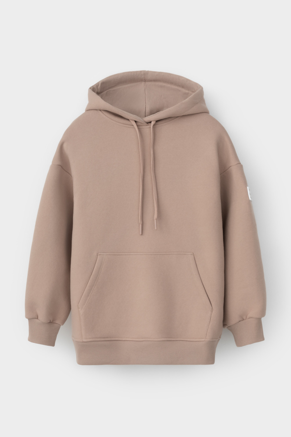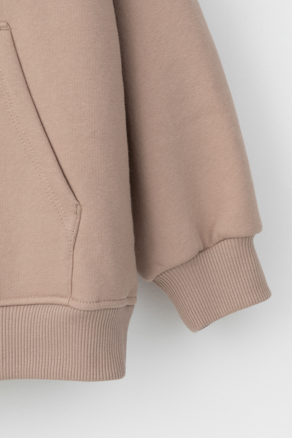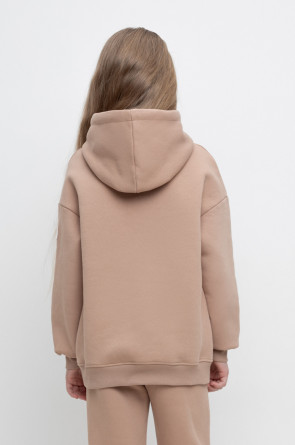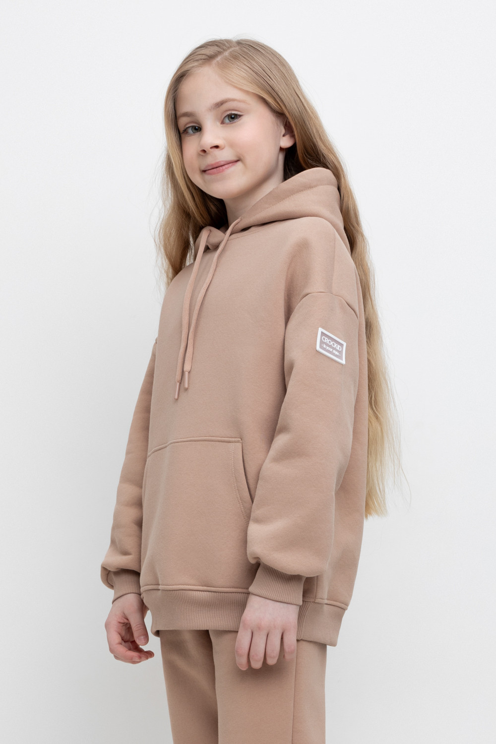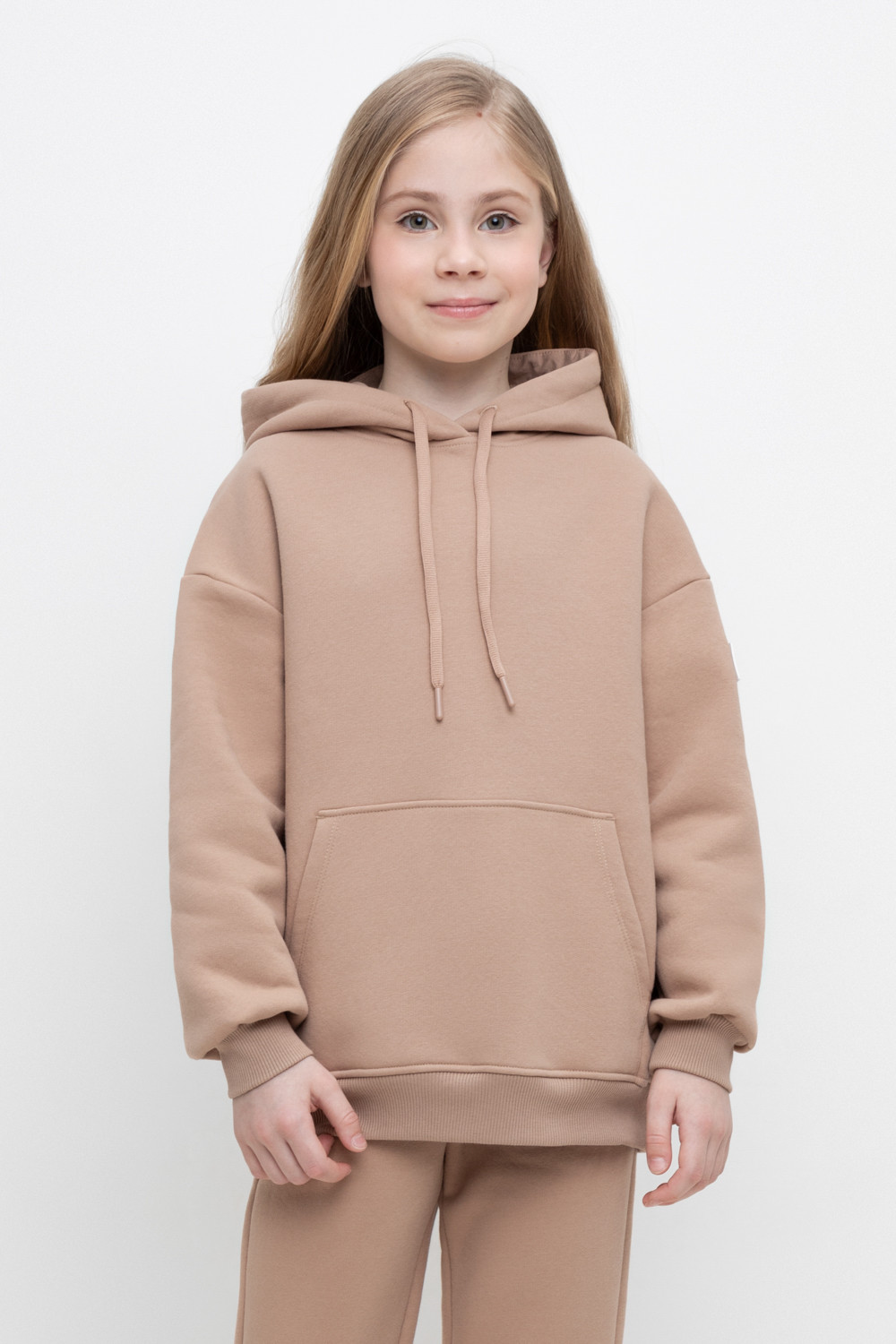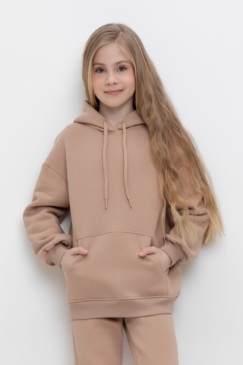Худи с капюшоном для девочки из футера трехнитки с начесом. Манжеты и пояс выполнены из эластичного полотна. Спереди удобный карман-кенгуру.