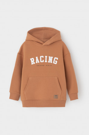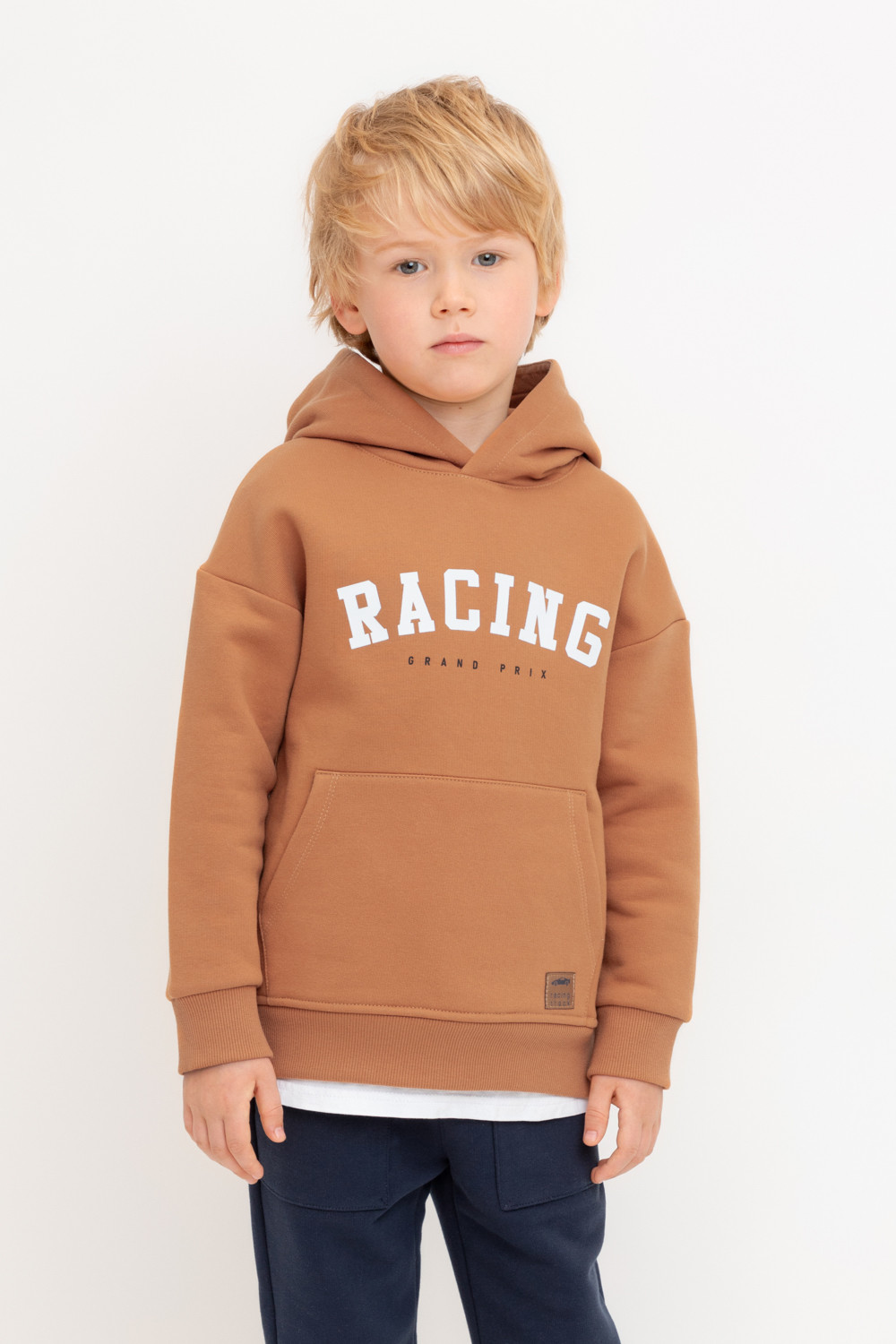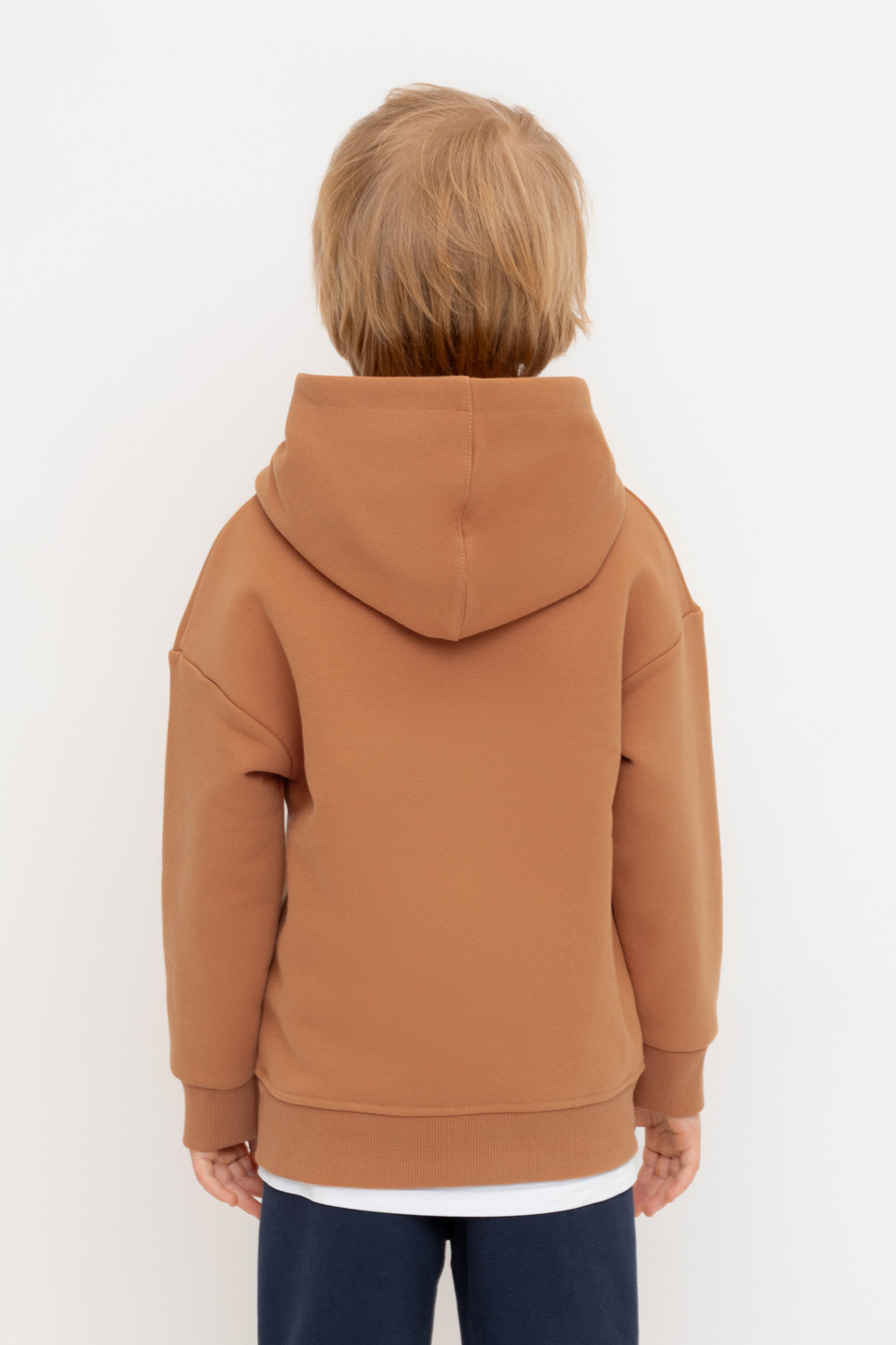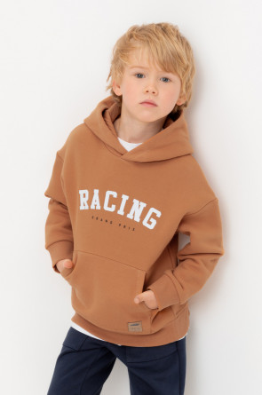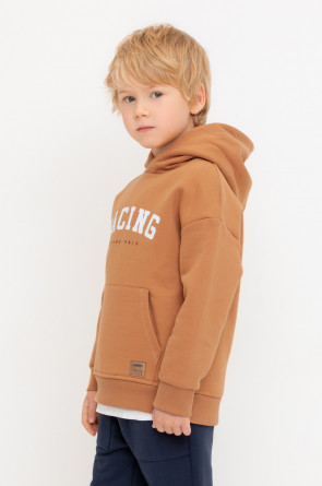 Худи с капюшоном для мальчика из футера трехнитки с начесом. Манжеты и пояс выполнены из эластичного полотна. Спереди удобный карман-кенгуру.