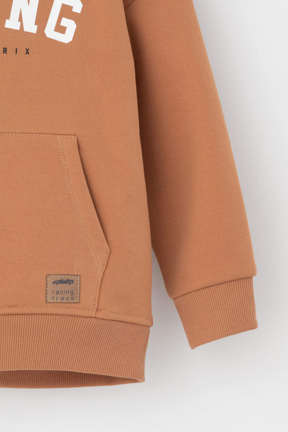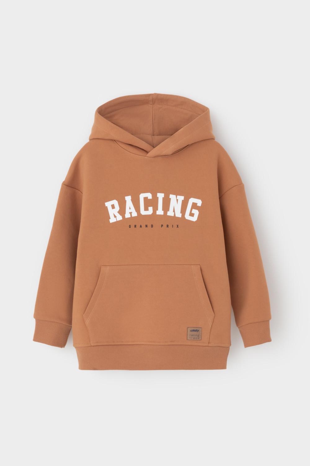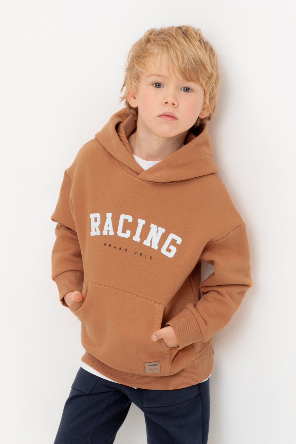 Худи с капюшоном для мальчика из футера трехнитки с начесом. Манжеты и пояс выполнены из эластичного полотна. Спереди удобный карман-кенгуру.