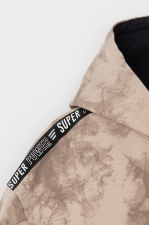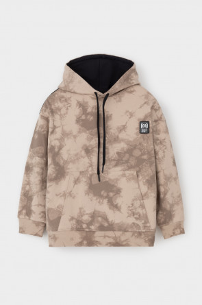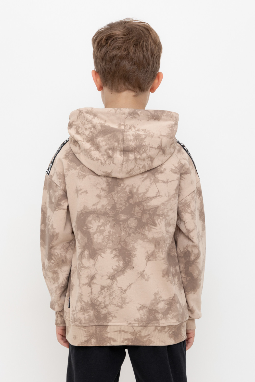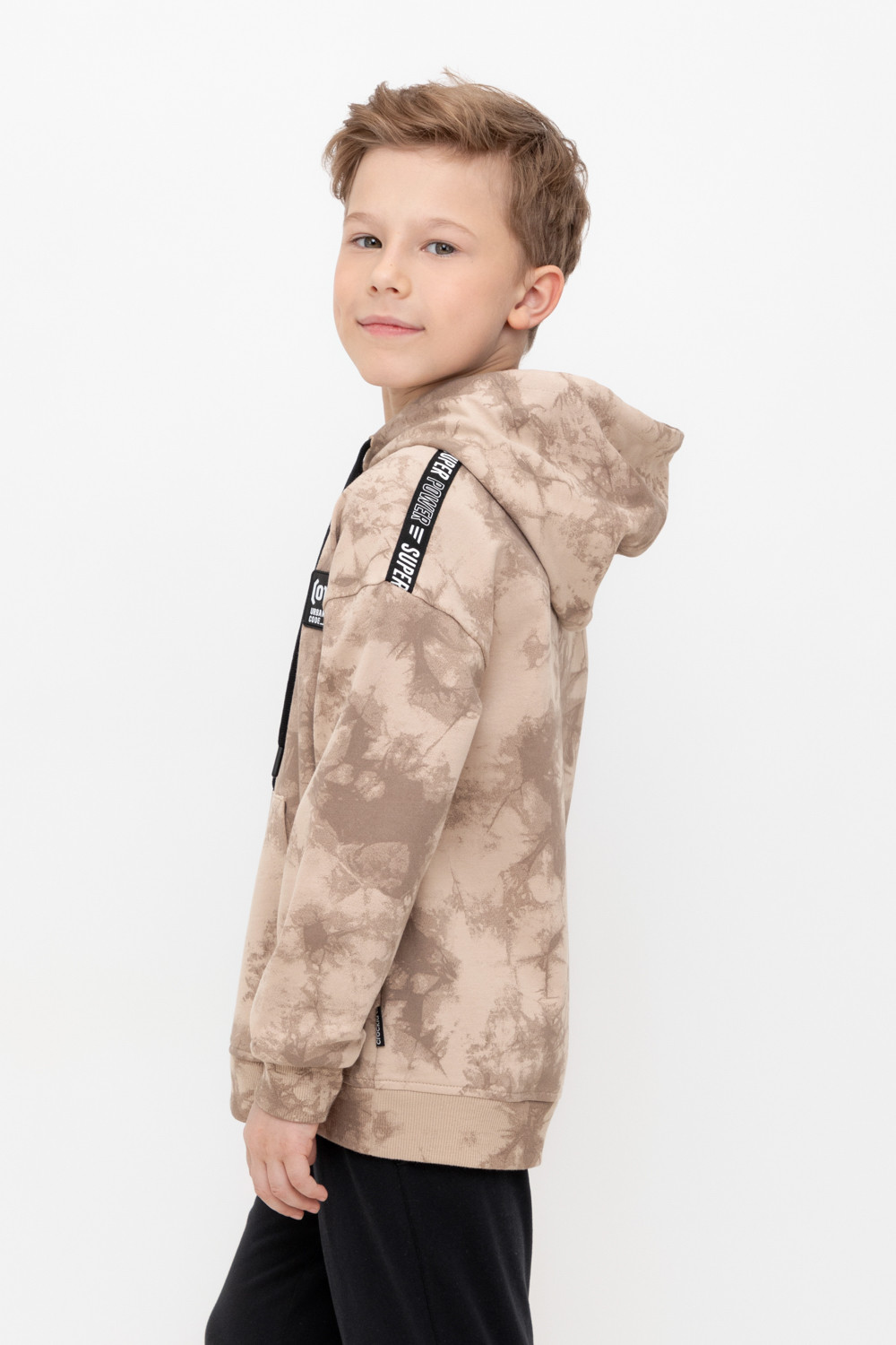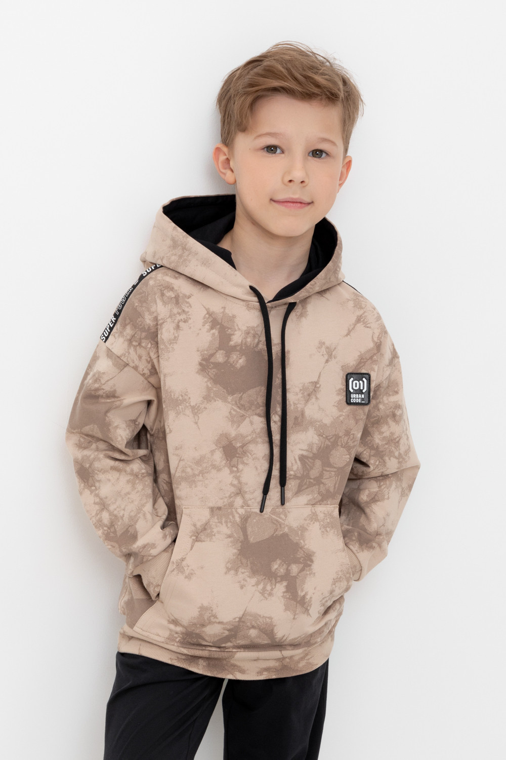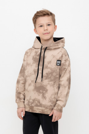 Худи с капюшоном для мальчика из петельчатого футера диагональ. Манжеты и пояс выполнены из эластичного полотна. Спереди удобный карман-кенгуру. Набивка выполнена из стойких текстильных красителей.