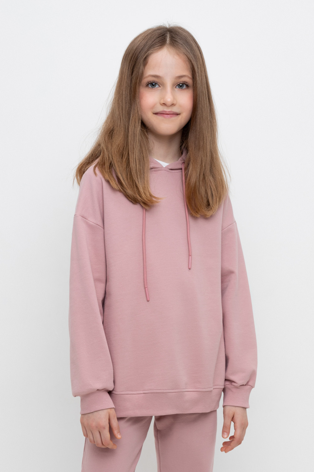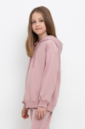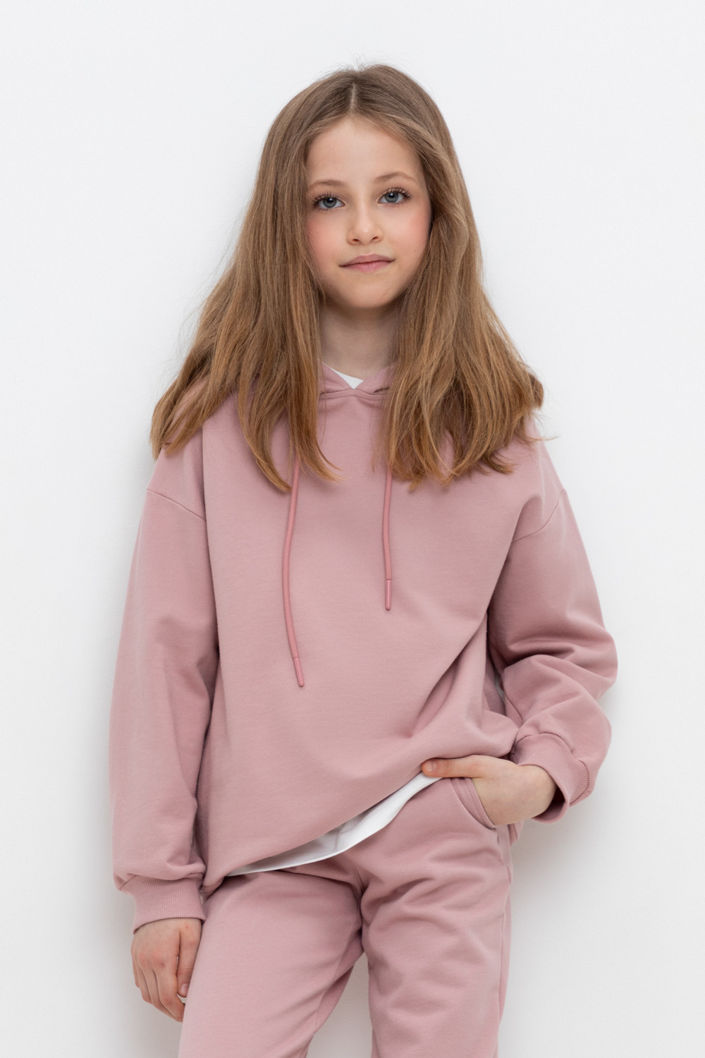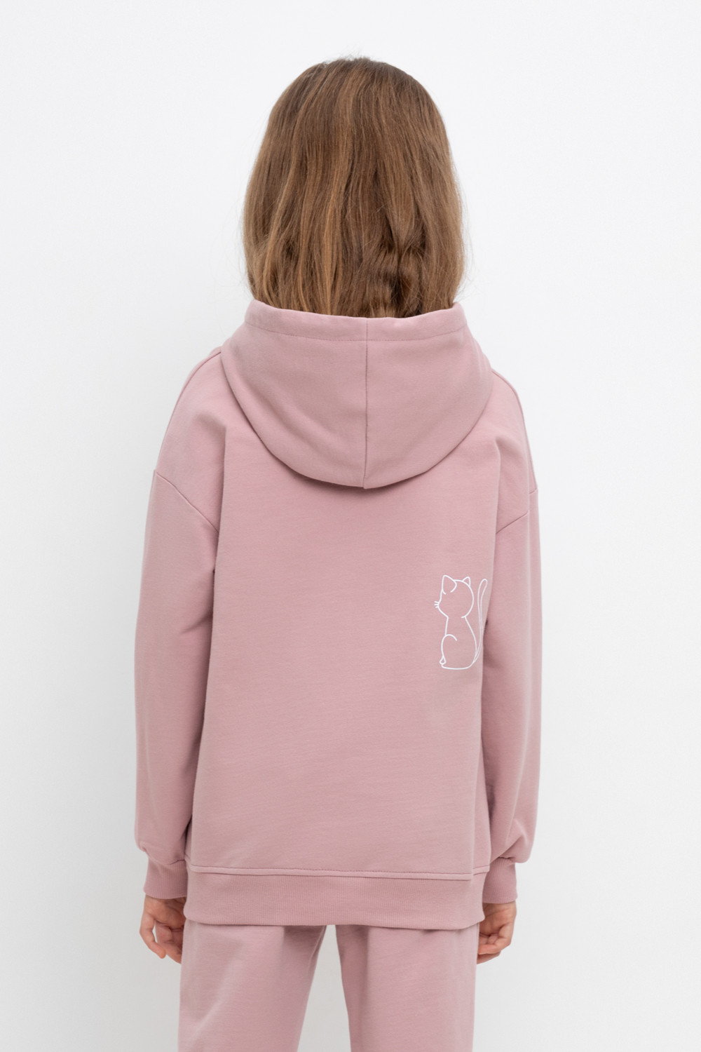 Худи с капюшоном для девочки из футера трехнитки с начесом. Манжеты и пояс выполнены из эластичного полотна. Принт на спинке.