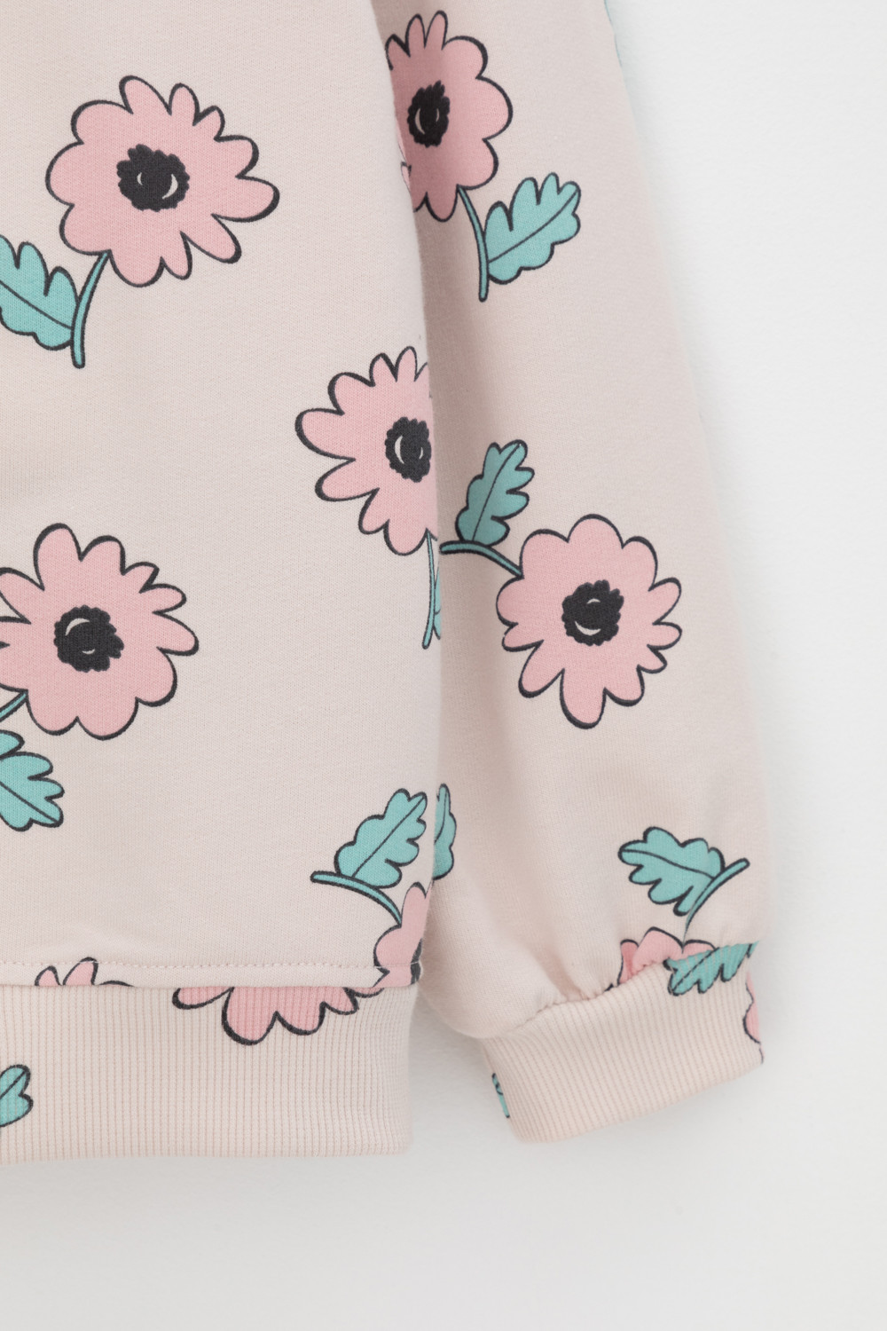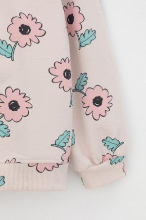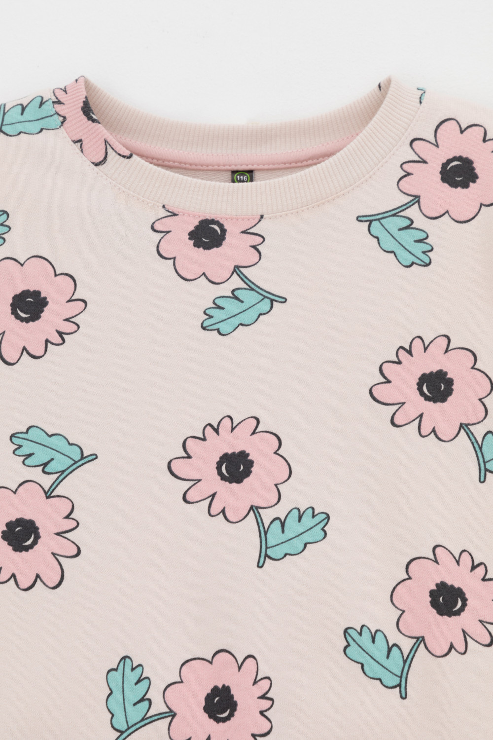 Свитшот для девочки из высококачественного петельчатого футера. Обтачка горловины, манжеты и пояс выполнены из эластичного полотна. Для удобства одевания на плече в размере 98 есть застежка на кнопки. Оригинальная набивка выполнена из стойких текстильных гипоаллергенных красителей.