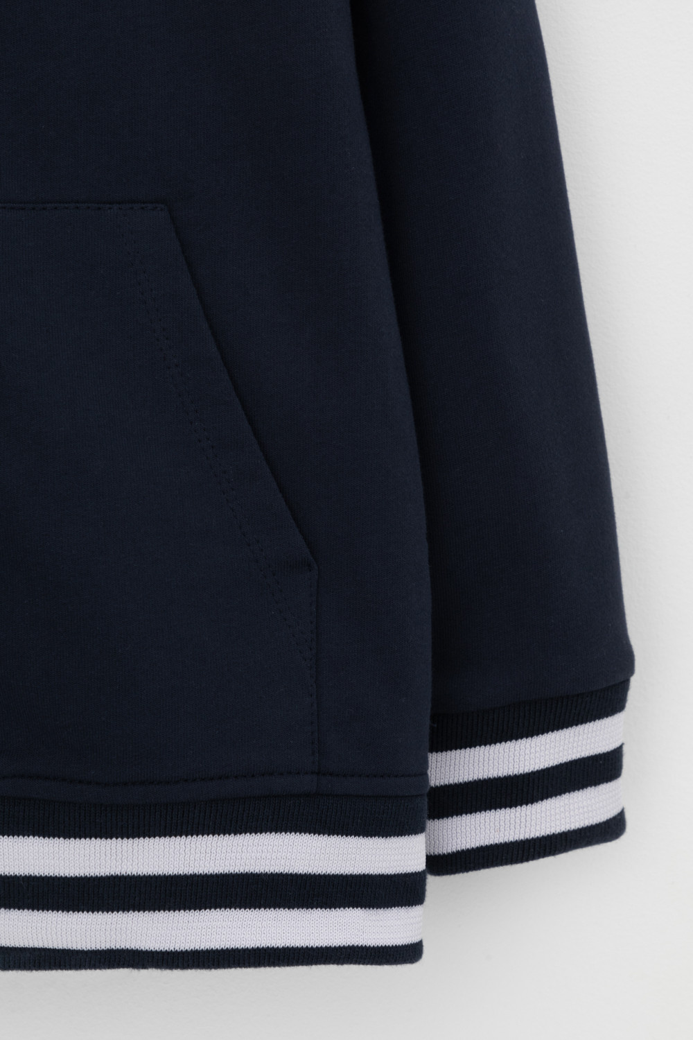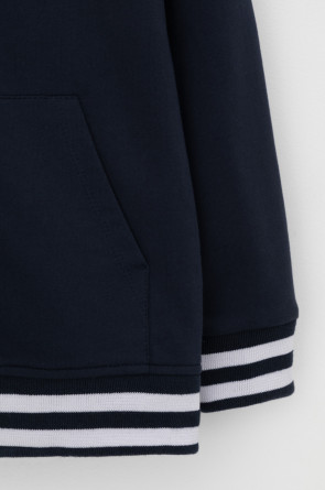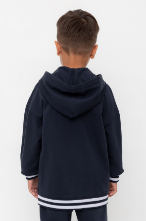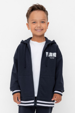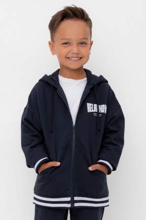 Толстовка с капюшоном для мальчика из мягкого трикотажа. В составе 80% натурального хлопка и 20% полиэстера, при этом полиэстер ввязан внутрь по особой технологии и не соприкасается с кожей. Воротник, манжеты и пояс - вязаные. Спереди два удобных накладных кармана.