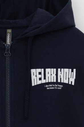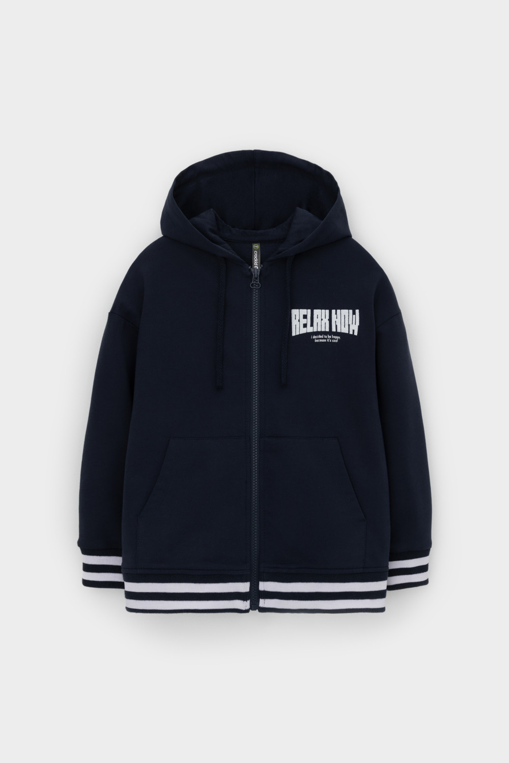 Толстовка с капюшоном для мальчика из мягкого трикотажа. В составе 80% натурального хлопка и 20% полиэстера, при этом полиэстер ввязан внутрь по особой технологии и не соприкасается с кожей. Воротник, манжеты и пояс - вязаные. Спереди два удобных накладных кармана.