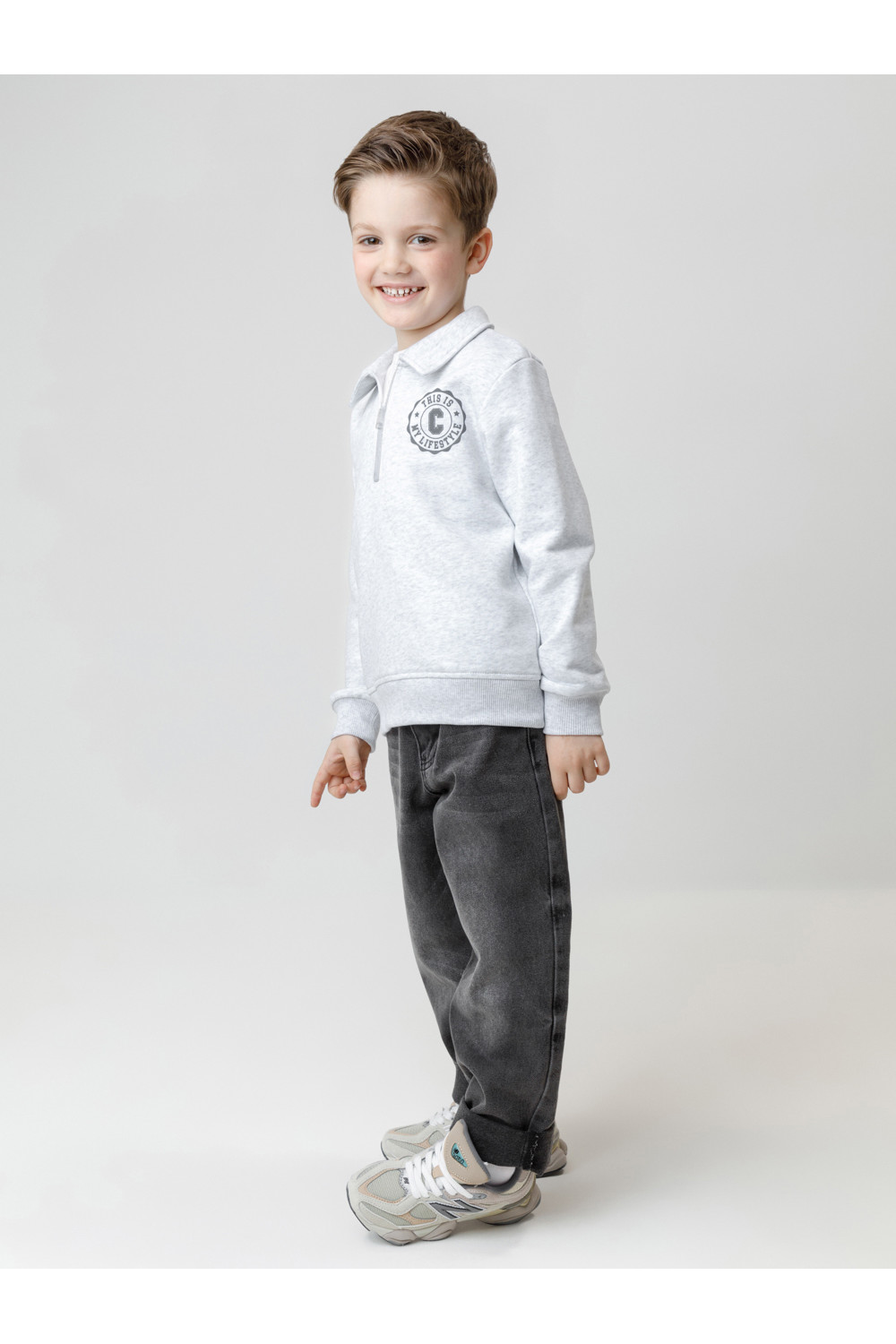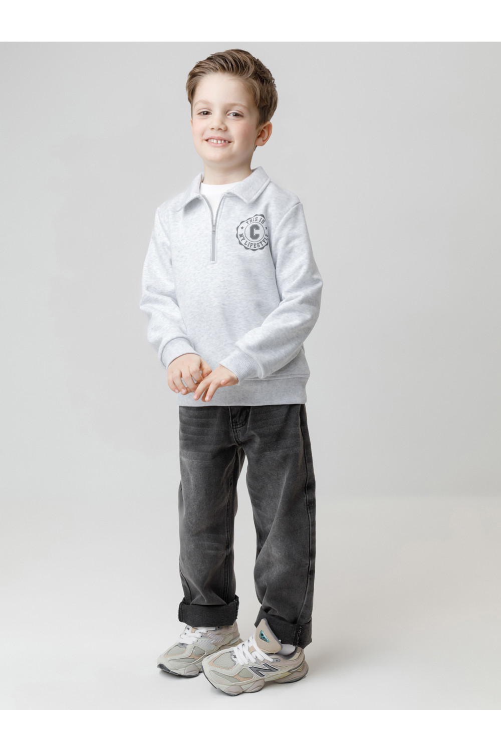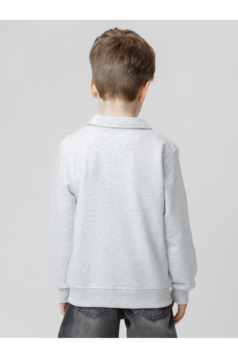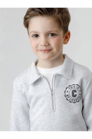 Свитшот с воротником для мальчика. Изготовлен из высококачественного петельчатого футера. В составе 80% натурального хлопка и 20% полиэстера, при этом полиэстер ввязан внутрь по особой технологии и не соприкасается с кожей. Манжеты и пояс выполнены из эластичного полотна. На груди короткая застёжка на молнию. Оригинальный принт выполнен из стойких текстильных гипоаллергенных красителей. Изделие сохраняет цвет и форму после многократных стирок.