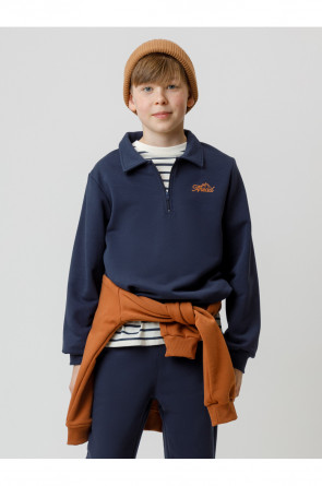 Свитшот с воротником для мальчика. Изготовлен из высококачественного петельчатого футера. В составе 80% натурального хлопка и 20% полиэстера, при этом полиэстер ввязан внутрь по особой технологии и не соприкасается с кожей. Манжеты и пояс выполнены из эластичного полотна. На груди короткая застёжка на молнию. Оригинальный принт выполнен из стойких текстильных гипоаллергенных красителей. Изделие сохраняет цвет и форму после многократных стирок.