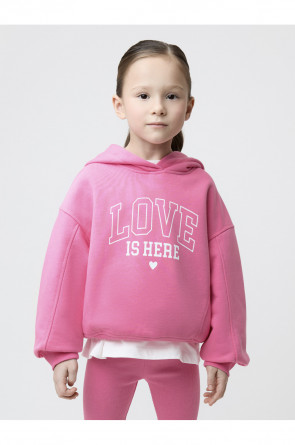 Худи для девочки из мягкого футера с оригинальным рисунком. В составе 80% натурального хлопка и 20% полиэстера, при этом полиэстер ввязан внутрь по особой технологии и не соприкасается с кожей. Манжеты и пояс выполнены из эластичного трикотажа в рубчик. Изделие сохраняет цвет и форму после многократных стирок. Все трикотажные полотна производятся в соответствии с нормами швейцарского сертификата ЭкоТекс.