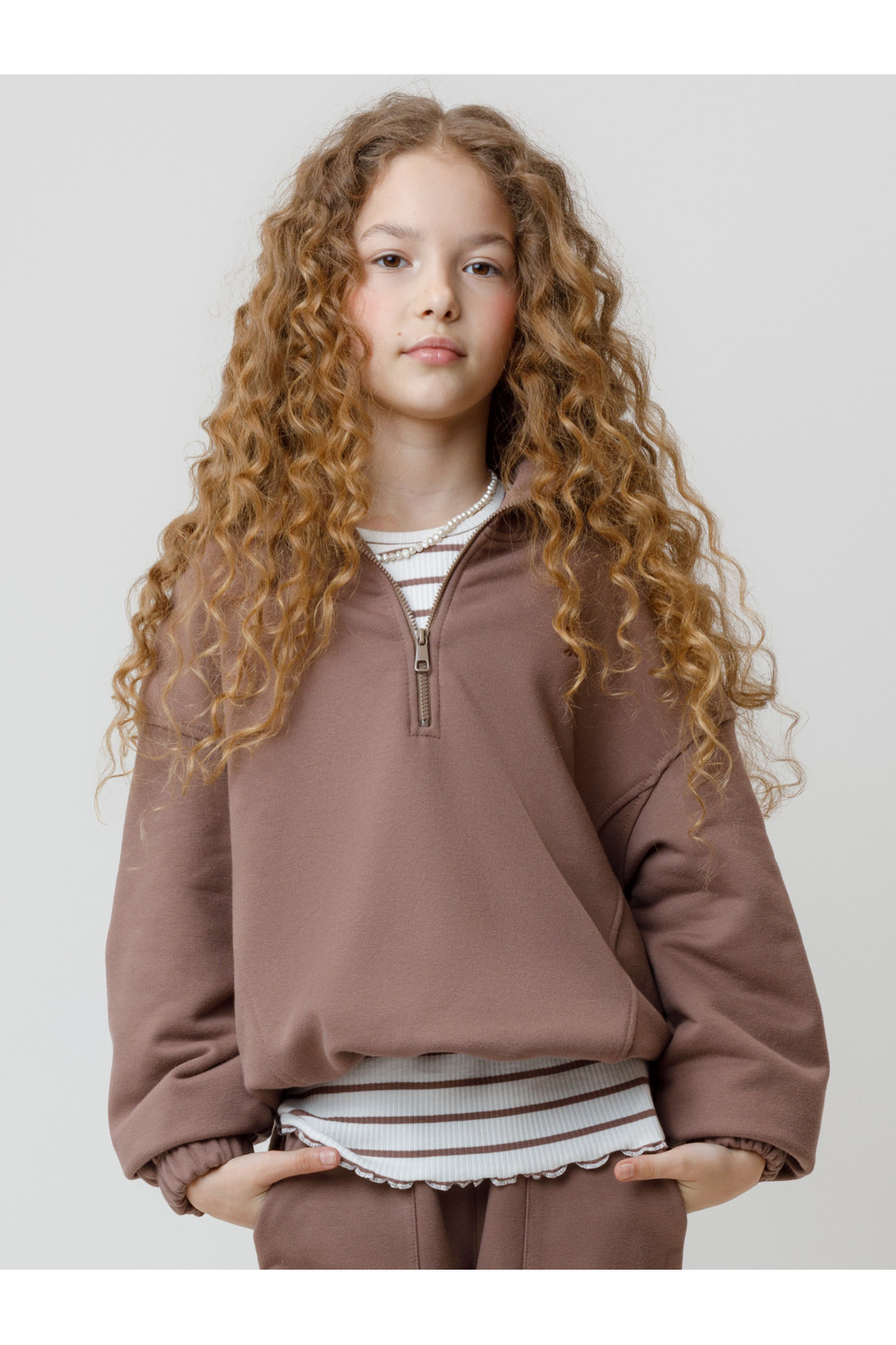 Мягкий свитшот с вышивкой для девочки. Изготовлен из высококачественного футера петли трёхнитки. Спереди застёгивается на короткую металлическую молнию. Воротник выполнен из эластичного полотна в рубчик. Рукава со спущенными плечами и низ изделия собраны на резинку. Свитшот сохраняет форму и стойкий цвет после многочисленных стирок и идеально подходит на каждый день. Все трикотажные полотна производятся в соответствии с нормами швейцарского сертификата ЭкоТекс.