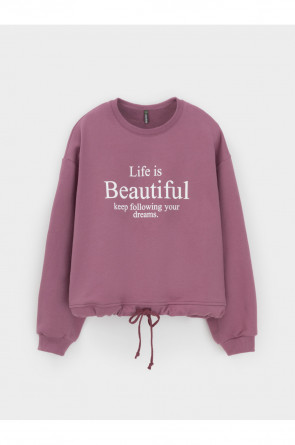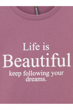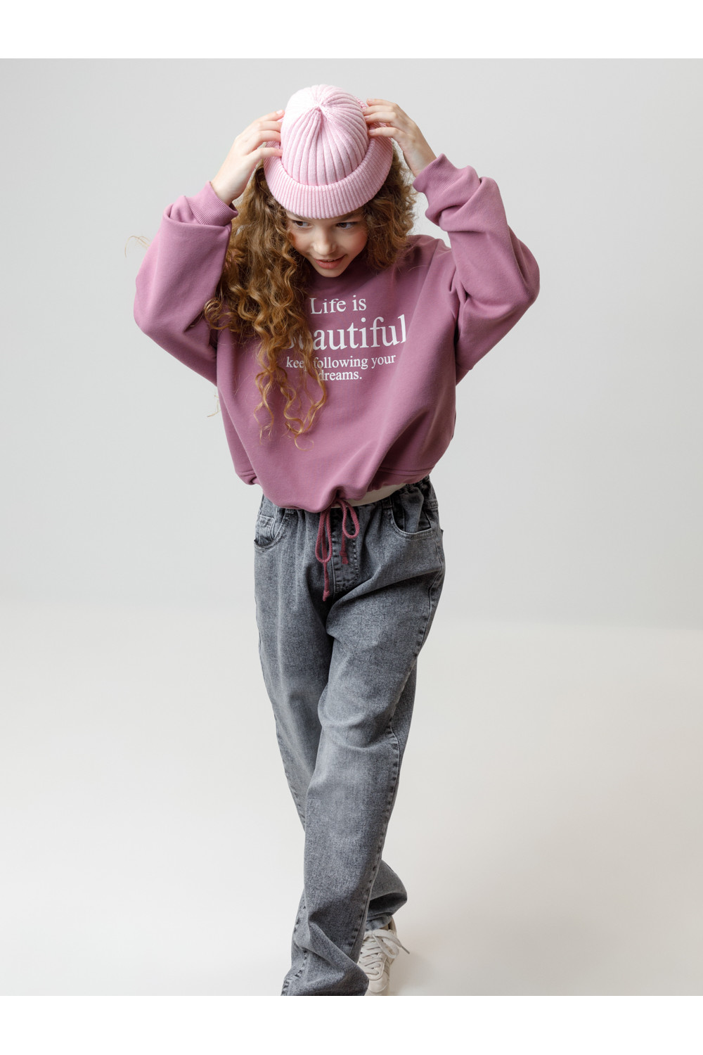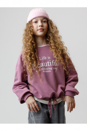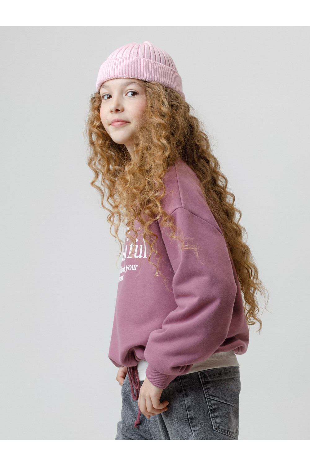 Свитшот для девочки из мягкого петельчатого трикотажа. В составе 80% натурального хлопка и 20% полиэстера, при этом полиэстер ввязан внутрь по особой технологии и не соприкасается с кожей. Манжеты выполнены из эластичного полотна. Пояс регулируется по ширине при помощи шнурка. Оригинальный принт выполнен из стойких текстильных гипоаллергенных красителей. Изделие сохраняет цвет и форму после многократных стирок. Все трикотажные полотна производятся в соответствии с нормами швейцарского сертификата ЭкоТекс.