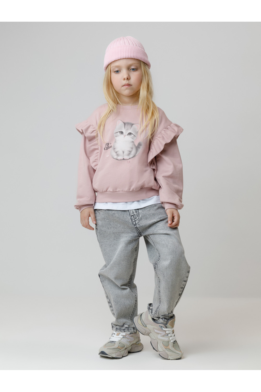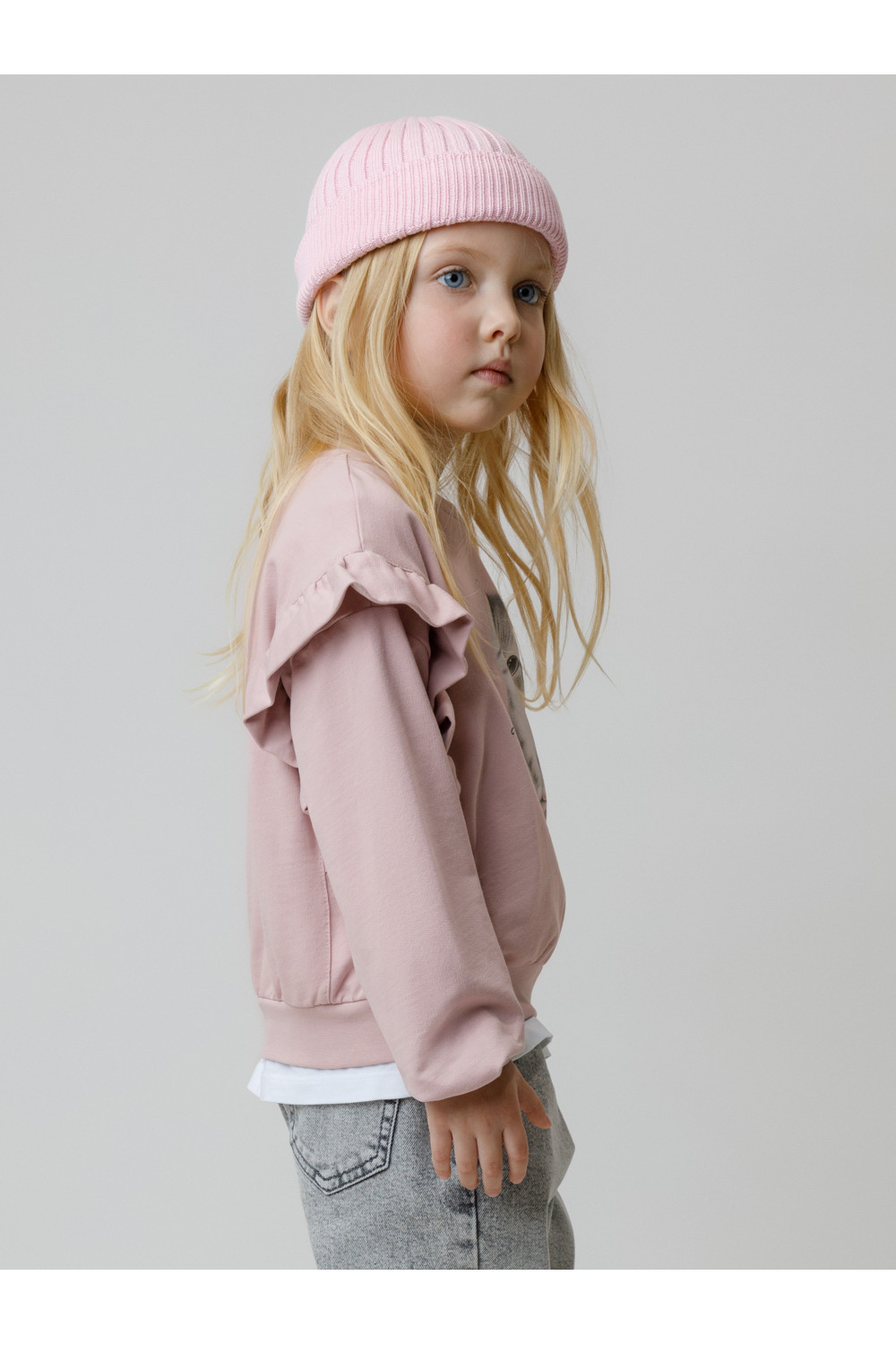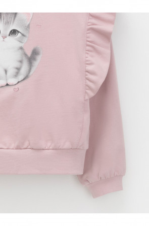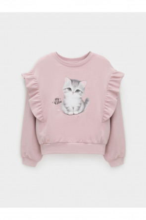 Свитшот для девочки из мягкого петельчатого трикотажа, произведённого из высококачественного натурального хлопка. В размерах 92 и 98 застёгивается на спине на кнопки. Манжеты и пояс выполнены из эластичного полотна. Украшен воздушными рюшами. Оригинальный принт выполнен из стойких текстильных гипоаллергенных красителей. Изделие сохраняет цвет и форму после многократных стирок. Все трикотажные полотна производятся в соответствии с нормами швейцарского сертификата ЭкоТекс.