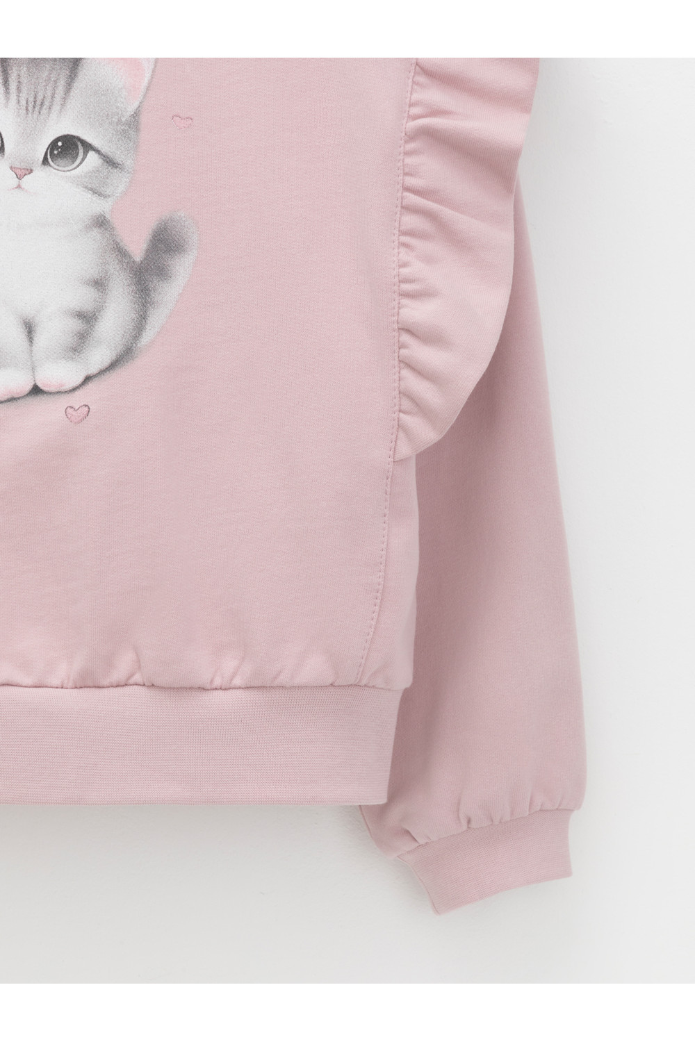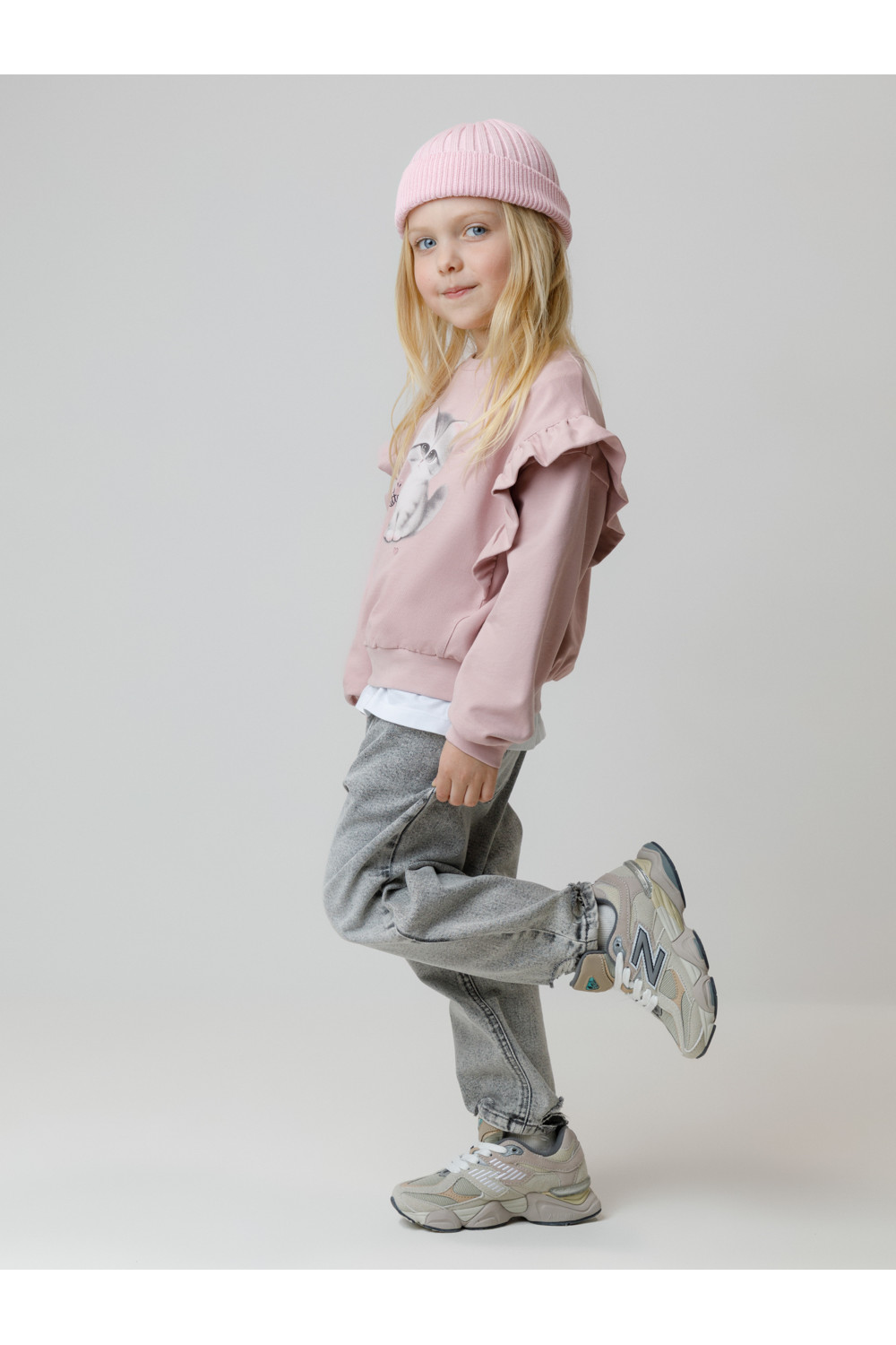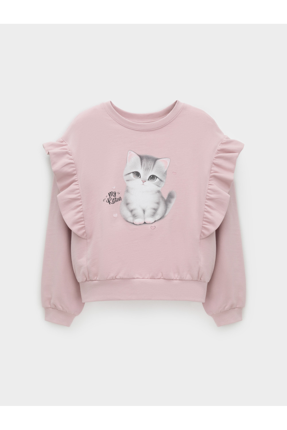 Свитшот для девочки из мягкого петельчатого трикотажа, произведённого из высококачественного натурального хлопка. В размерах 92 и 98 застёгивается на спине на кнопки. Манжеты и пояс выполнены из эластичного полотна. Украшен воздушными рюшами. Оригинальный принт выполнен из стойких текстильных гипоаллергенных красителей. Изделие сохраняет цвет и форму после многократных стирок. Все трикотажные полотна производятся в соответствии с нормами швейцарского сертификата ЭкоТекс.