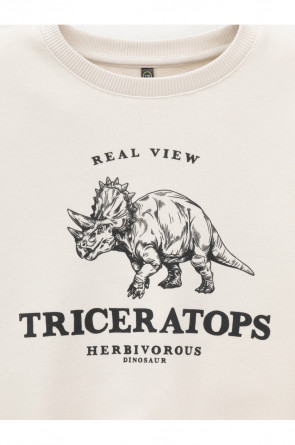 Свитшот для мальчика из высококачественного петельчатого футера трёхнитки. В составе 80% натурального хлопка и 20% полиэстера, при этом полиэстер ввязан внутрь по особой технологии и не соприкасается с кожей. Обтачка горловины, манжеты и пояс выполнены из эластичного полотна. Для удобства одевания имеется застёжка на кнопки в размерах 92 и 98. Оригинальный принт нанесён с помощью стойких текстильных гипоаллергенных красителей.