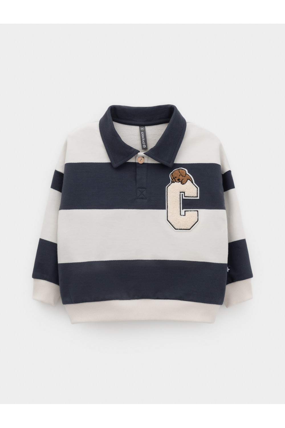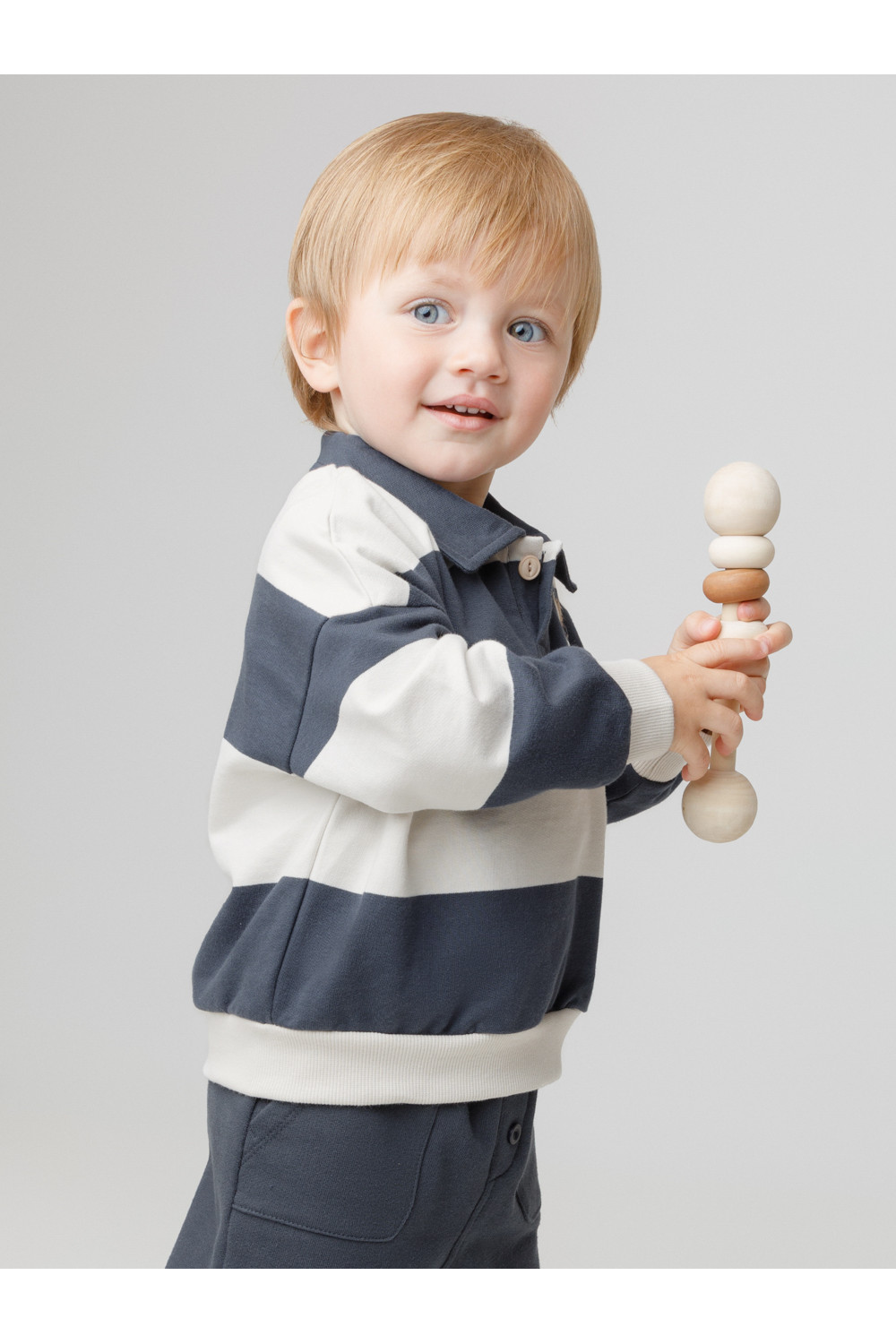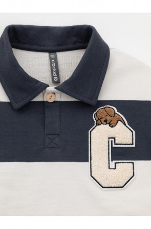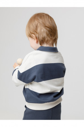 Свитшот с воротником для мальчика. Изготовлен из высококачественного петельчатого футера. Манжеты и пояс выполнены из эластичного полотна. На груди застёжка на пуговицу. Изделие сохраняет цвет и форму после многократных стирок.