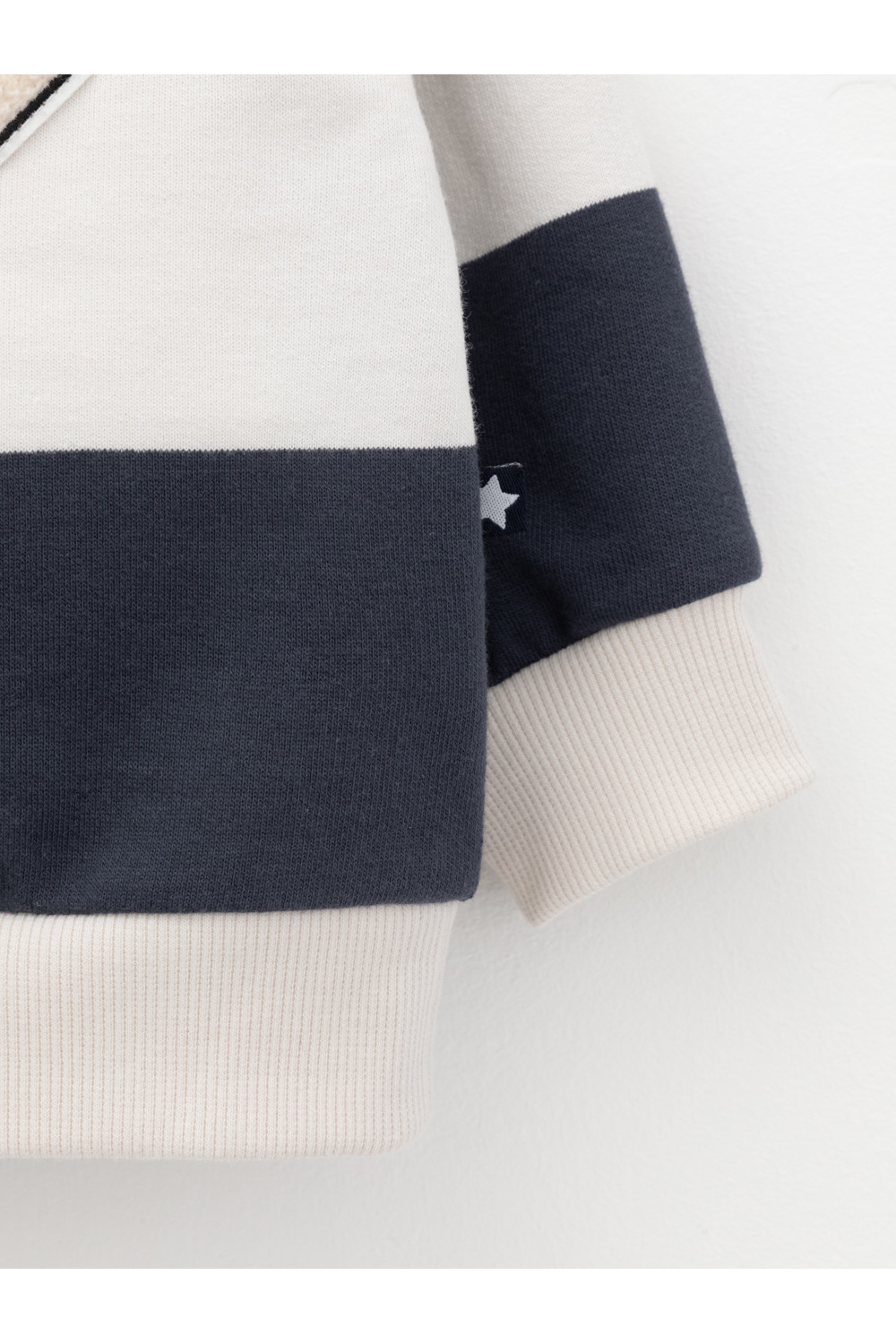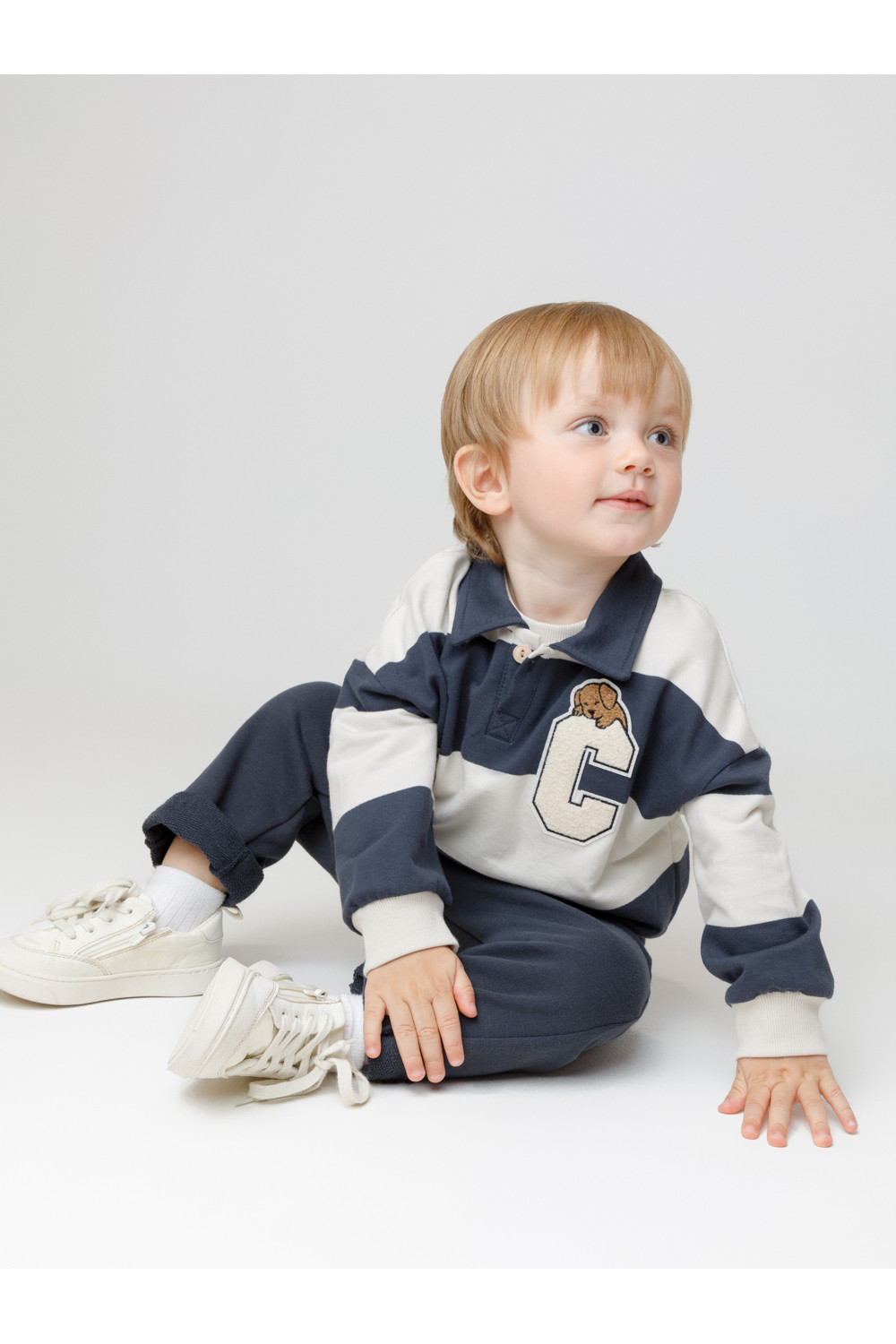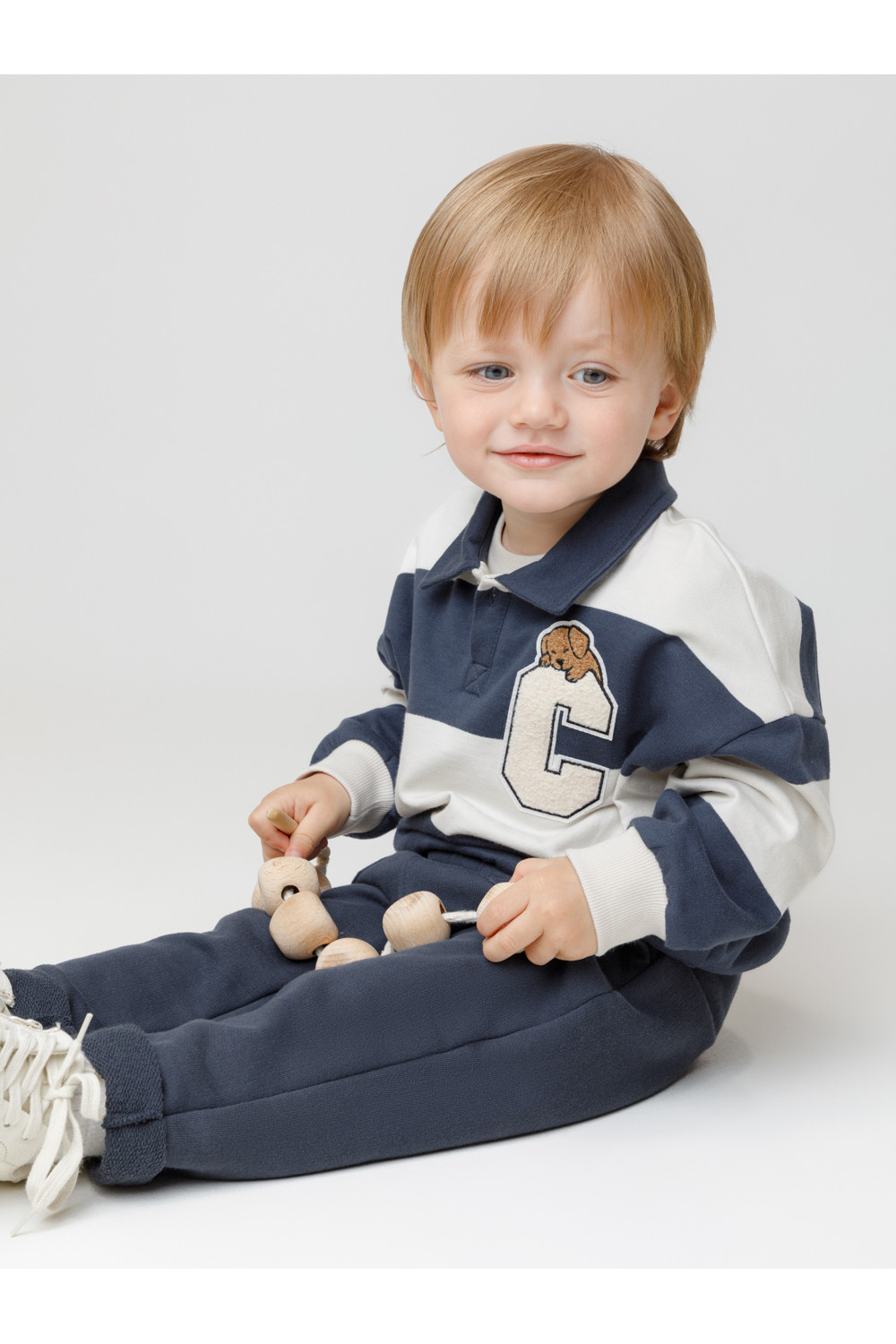 Свитшот с воротником для мальчика. Изготовлен из высококачественного петельчатого футера. Манжеты и пояс выполнены из эластичного полотна. На груди застёжка на пуговицу. Изделие сохраняет цвет и форму после многократных стирок.
