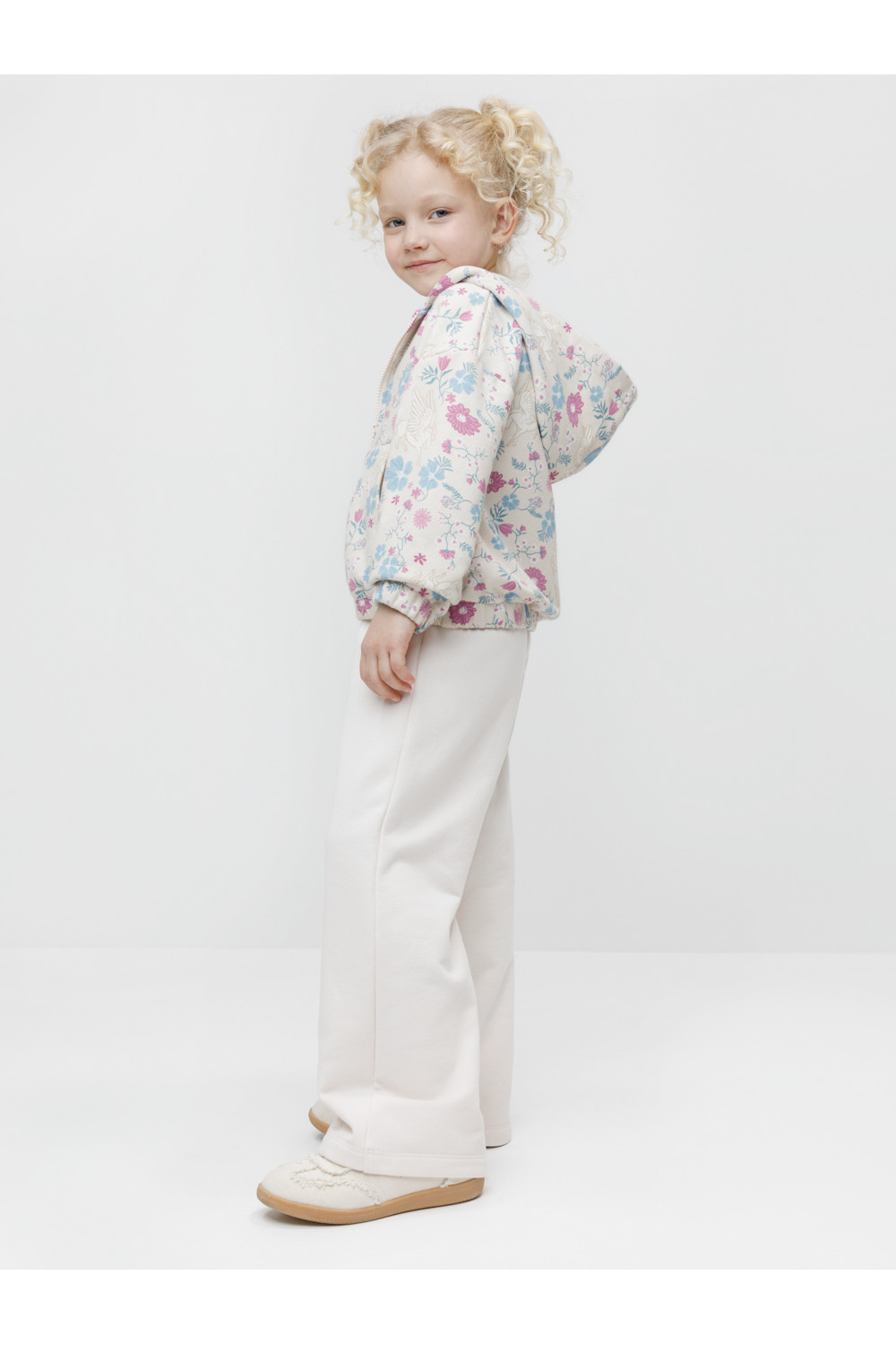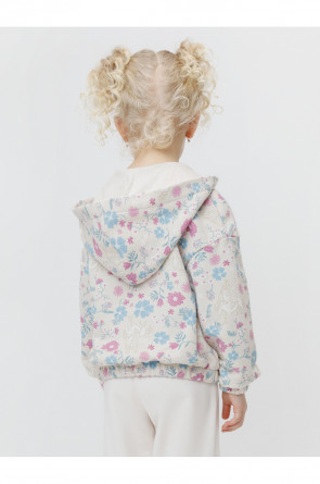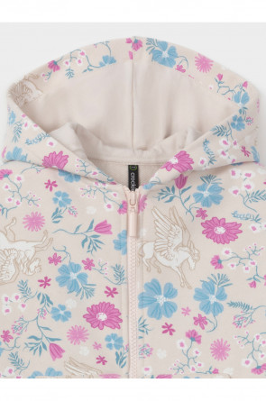 Трикотажная толстовка с капюшоном для девочки. Изготовлена из мягкого футера с оригинальным рисунком. В составе 80% натурального хлопка и 20% полиэстера, при этом полиэстер ввязан внутрь по особой технологии и не соприкасается с кожей. Застёгивается на молнию. Манжеты и пояс на резинке. Изделие сохраняет цвет и форму после многократных стирок. Все трикотажные полотна производятся в соответствии с нормами швейцарского сертификата ЭкоТекс.