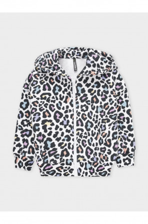Трикотажная толстовка с капюшоном для девочки. Изготовлена из мягкого футера с оригинальным рисунком. В составе 80% натурального хлопка и 20% полиэстера, при этом полиэстер ввязан внутрь по особой технологии и не соприкасается с кожей. Застёгивается на молнию. Эластичные манжеты и пояс выполнены из полотна в рубчик. Изделие сохраняет цвет и форму после многократных стирок. Все трикотажные полотна производятся в соответствии с нормами швейцарского сертификата ЭкоТекс.
