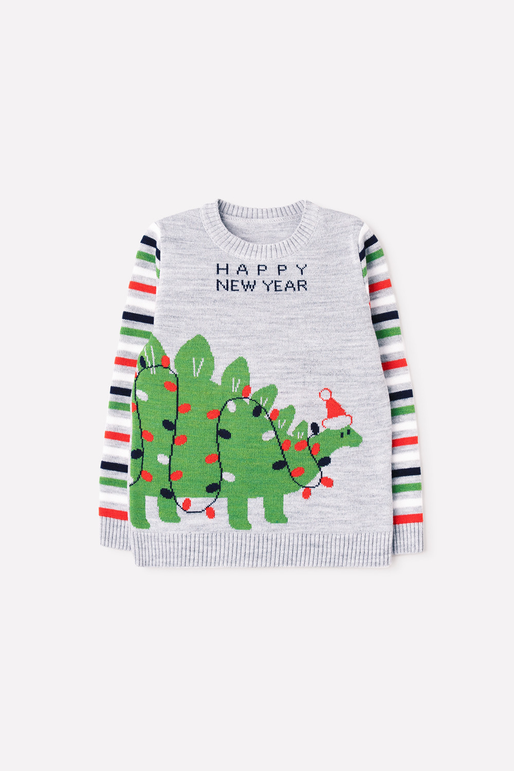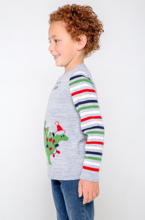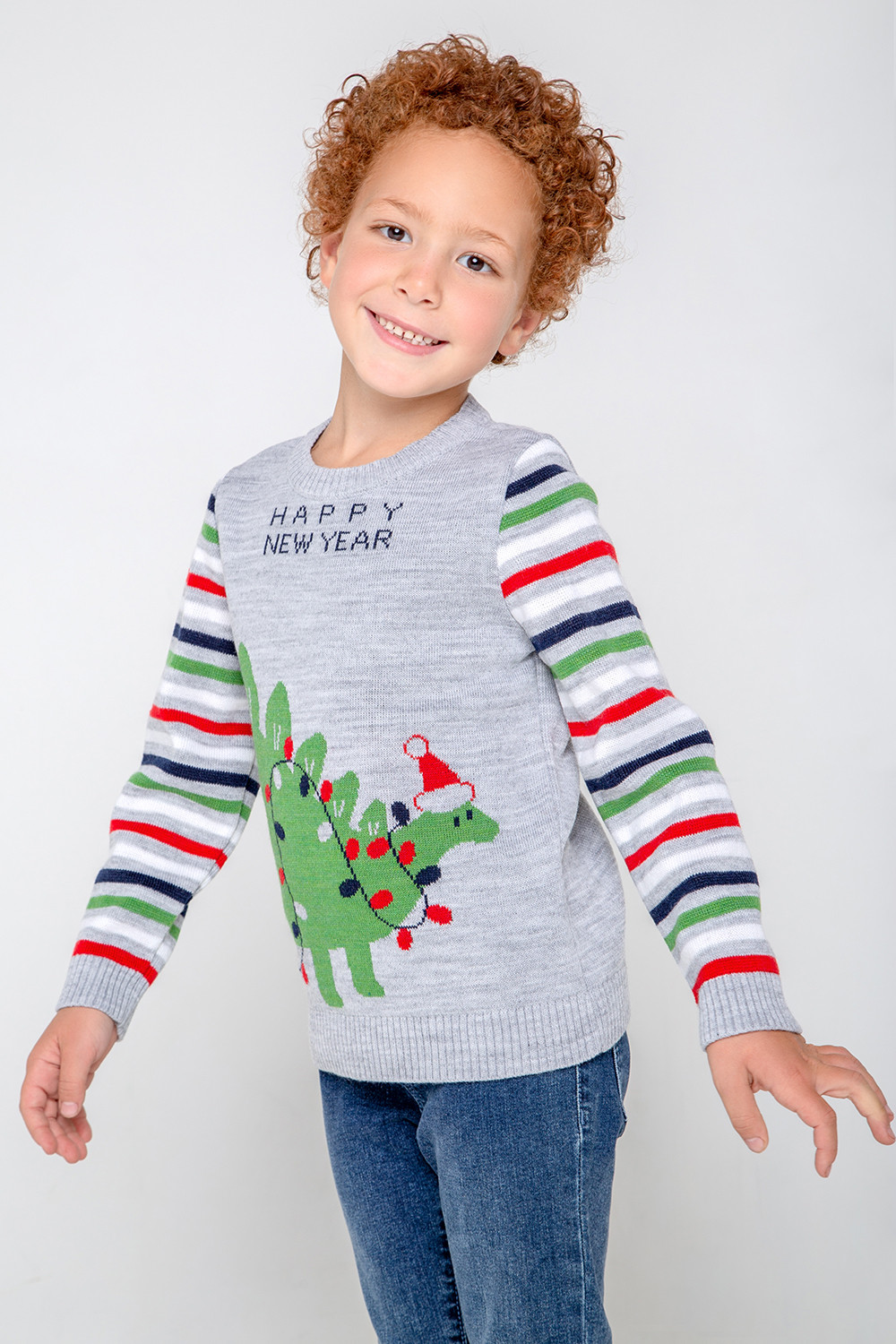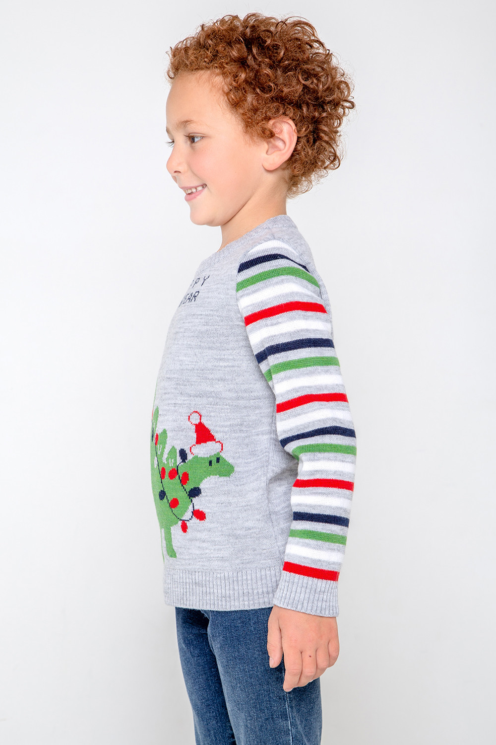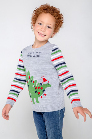 Серый джемпер с круглой горловиной. На груди - вывязанный рисунок с изображением новогоднего динозаврика. На рукавах - полосы. Горловина, манжеты и пояс связаны ластиком.