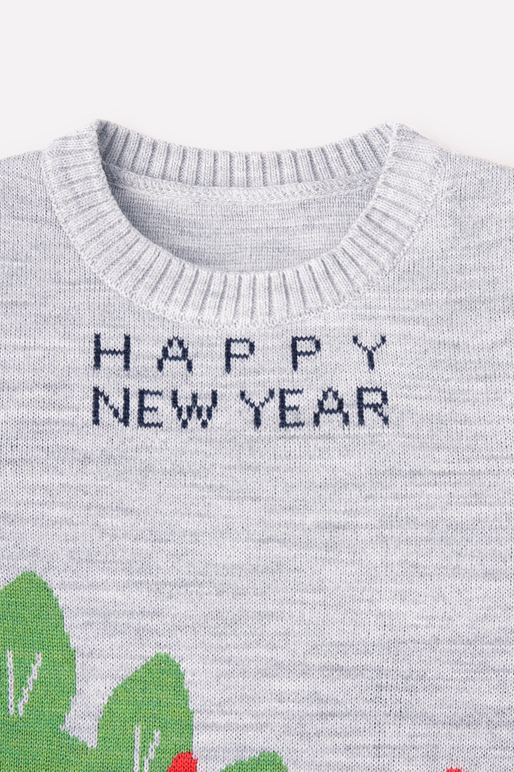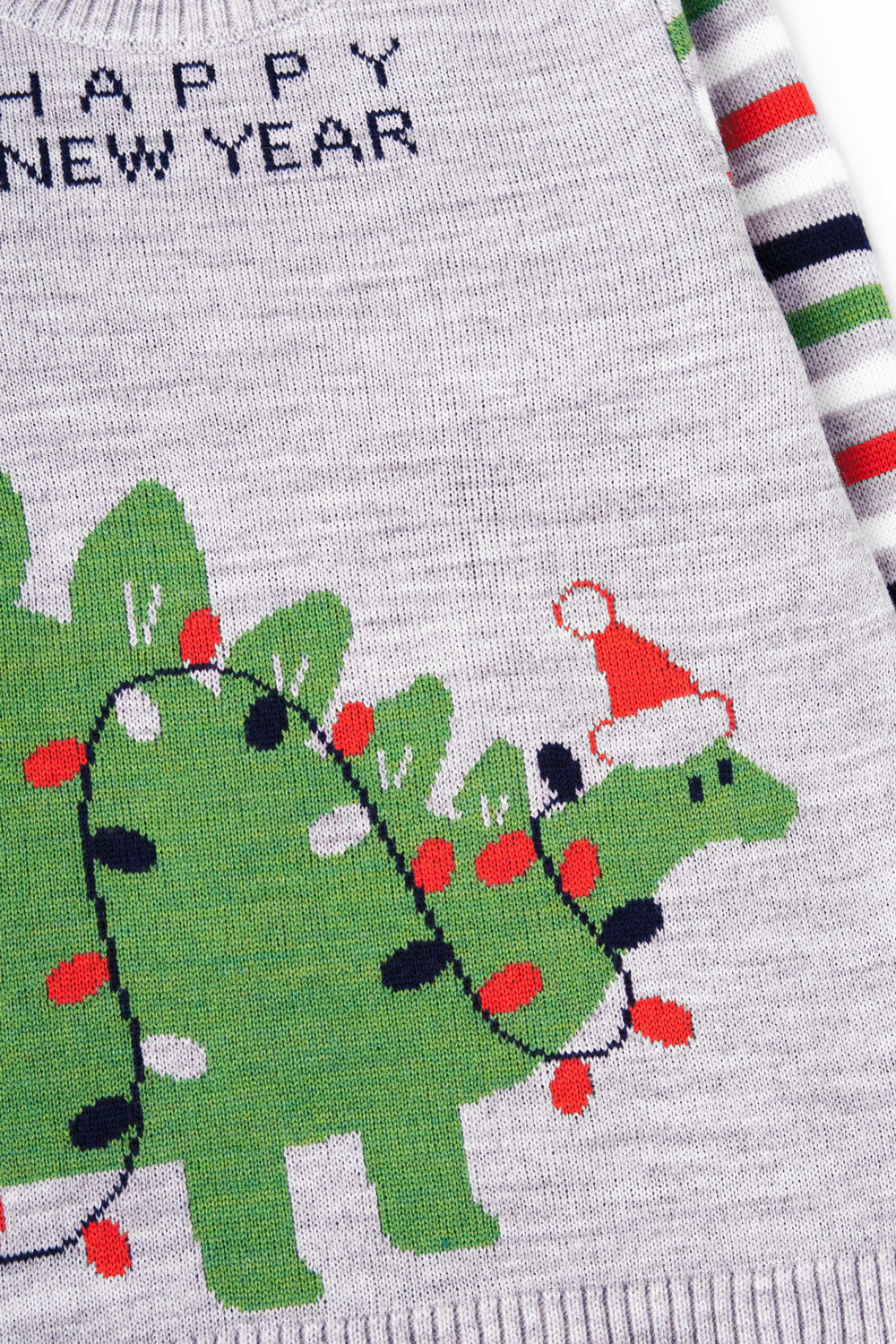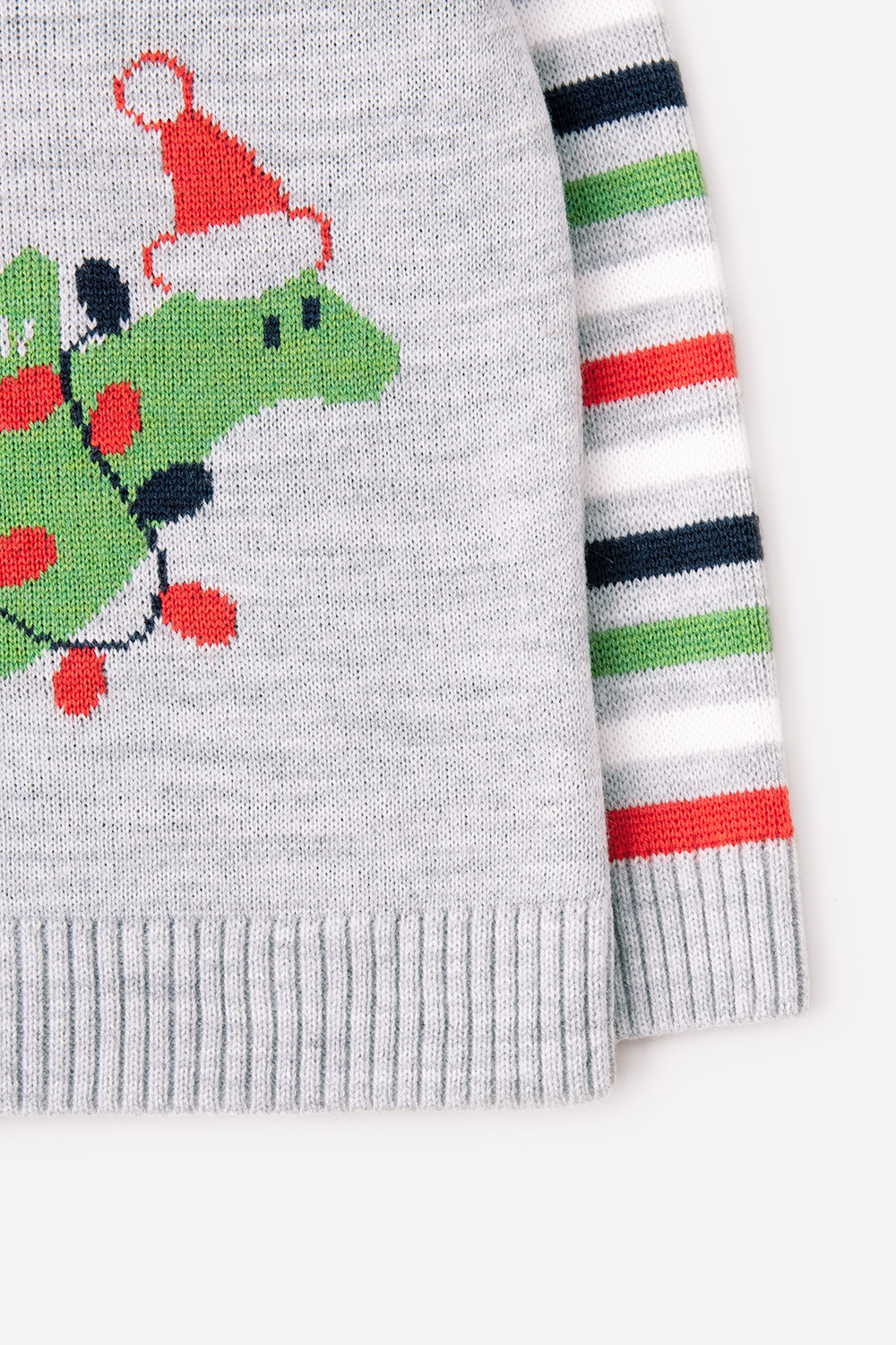 Серый джемпер с круглой горловиной. На груди - вывязанный рисунок с изображением новогоднего динозаврика. На рукавах - полосы. Горловина, манжеты и пояс связаны ластиком.