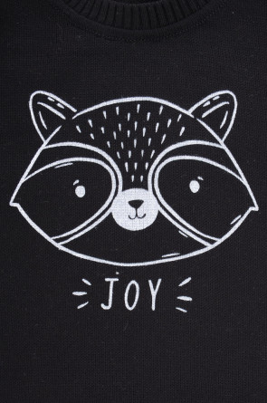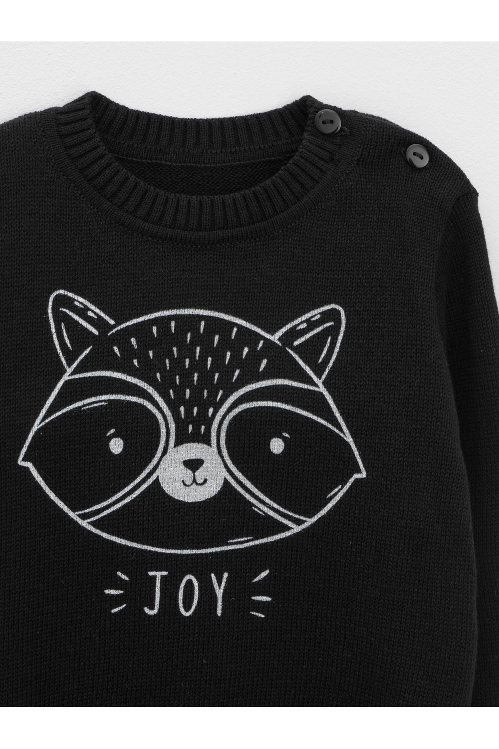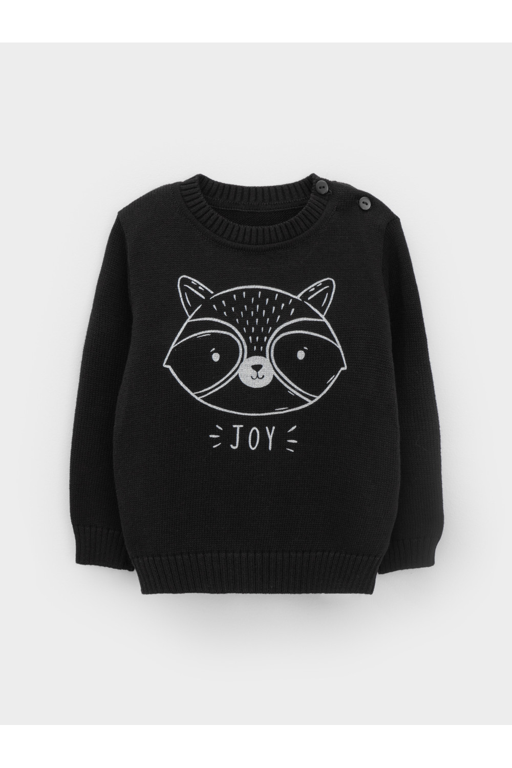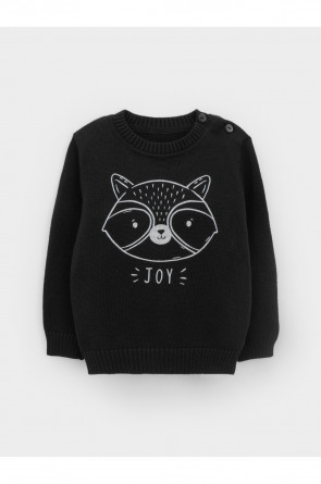 Вязаный джемпер с втачными рукавами. Украшен изображением енота. Связан из хлопковой пряжи. На рукавах эластичные манжеты. Внизу мягкий пояс. Застёгивается на пуговицу.