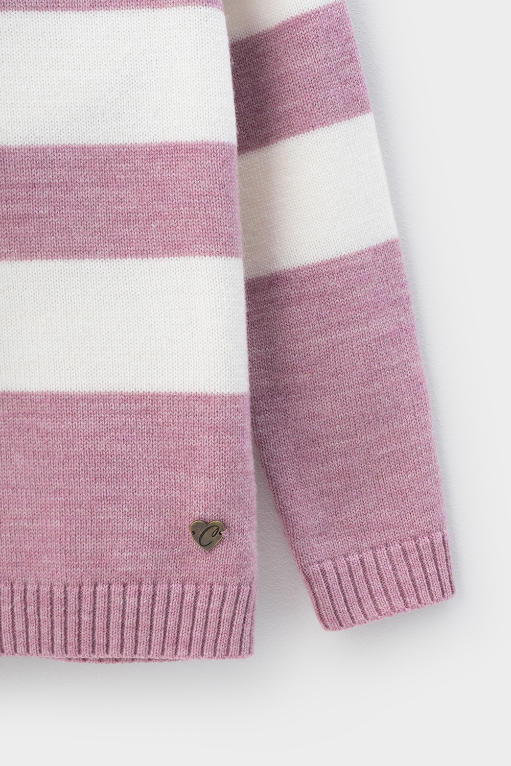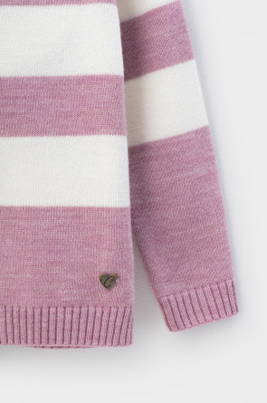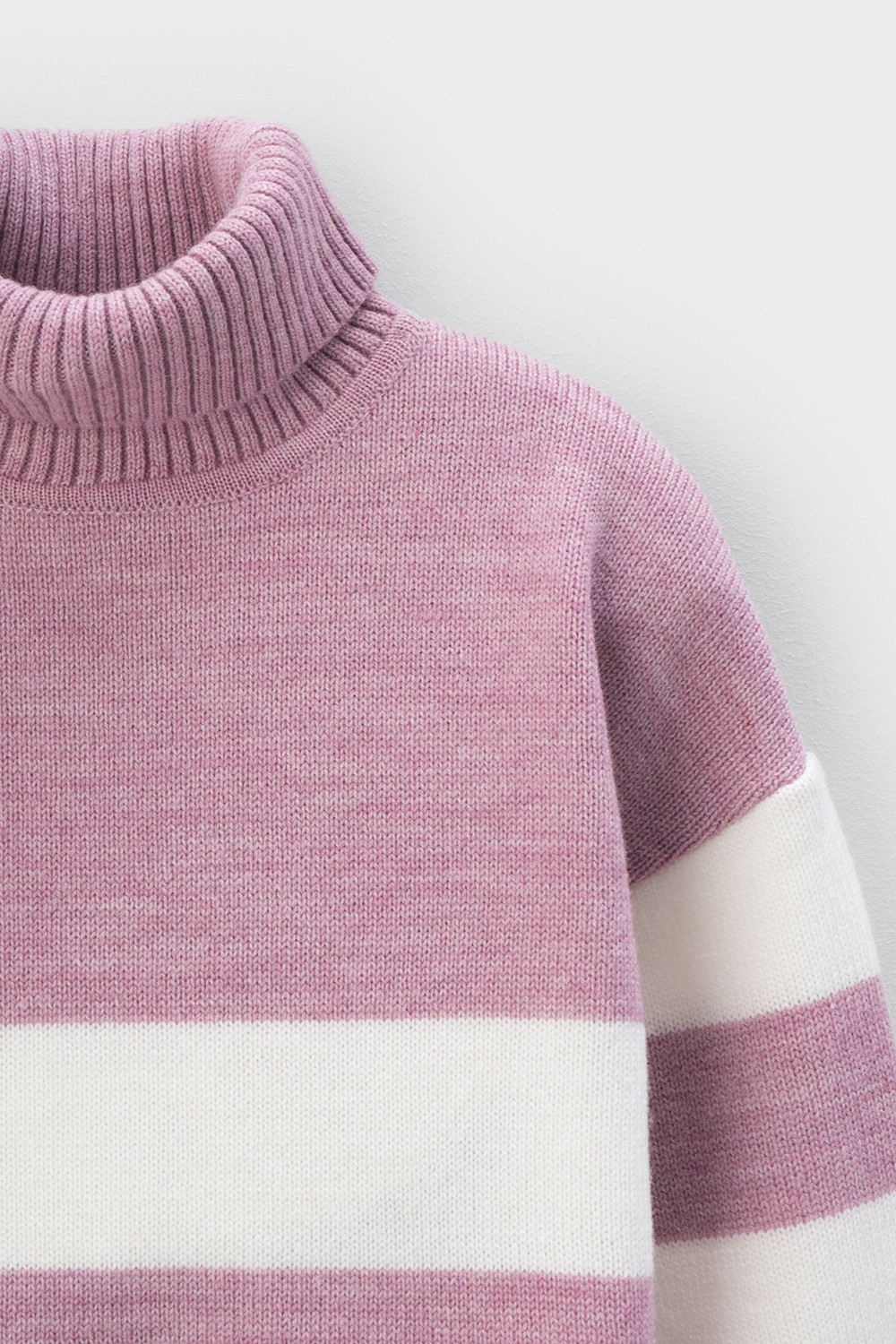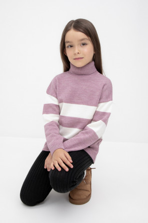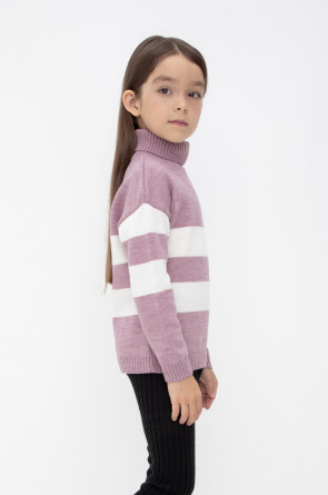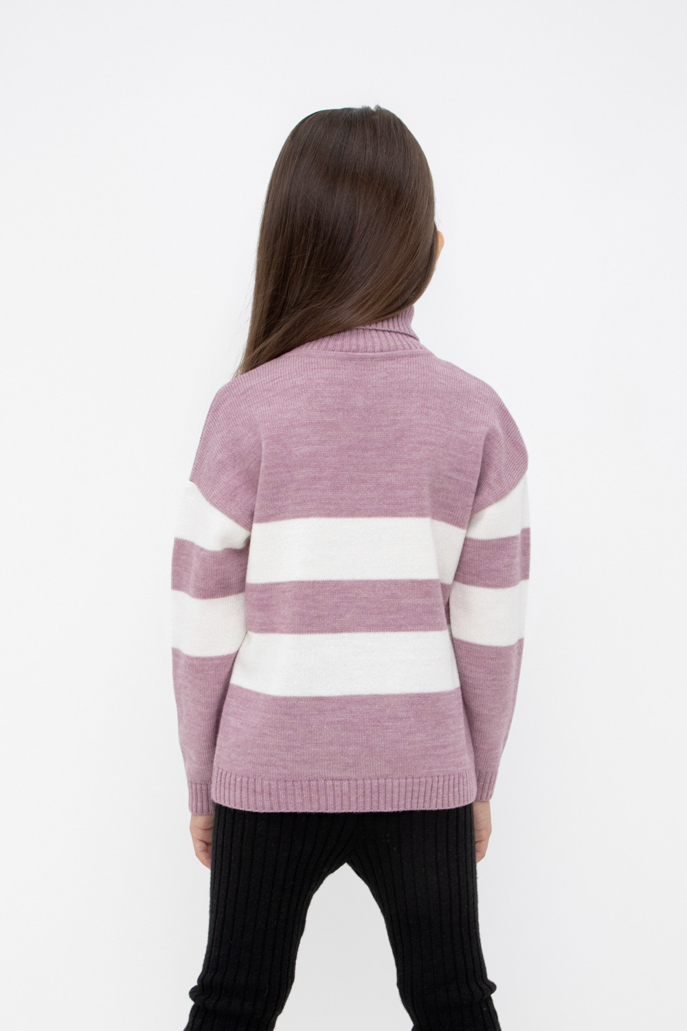 Вязаный джемпер для девочки из мягкой полушерстяной пряжи. Высокий воротник с отворотом хорошо защищает от холода. Длинные рукава с манжетами. Внизу эластичный пояс. Изделие сохраняет форму и стойкий цвет после многочисленных стирок.