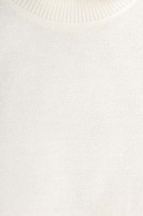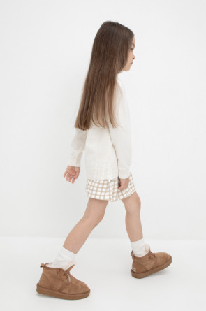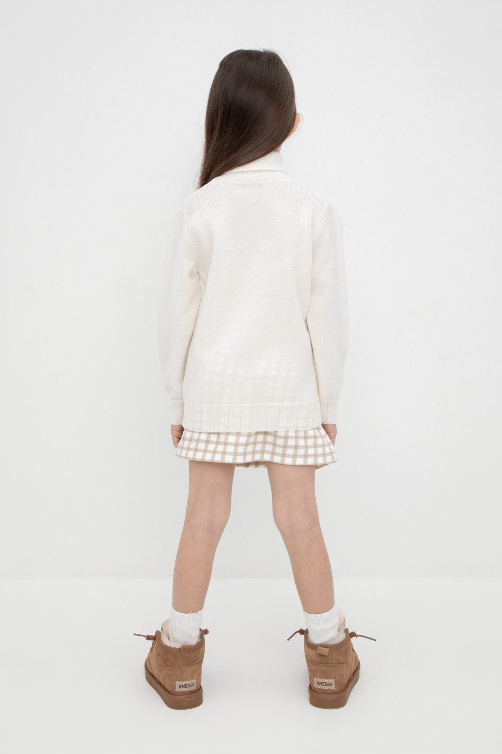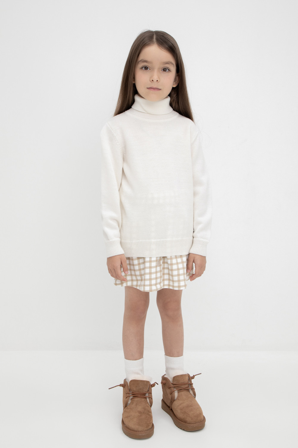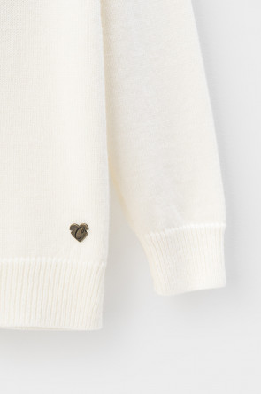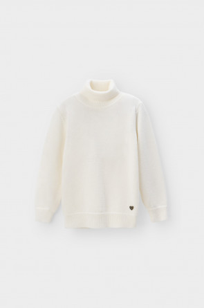 Вязаный джемпер для девочки из мягкой полушерстяной пряжи. Высокий воротник с отворотом хорошо защищает от холода. Изделие сохраняет форму и стойкий цвет после многочисленных стирок.
