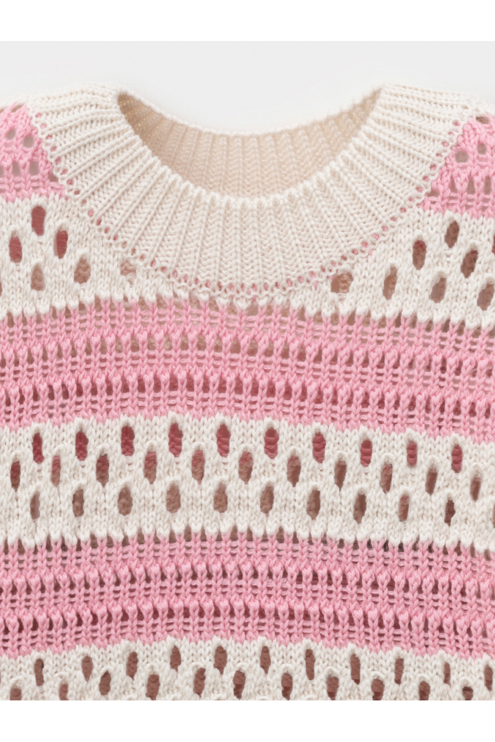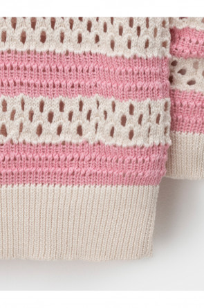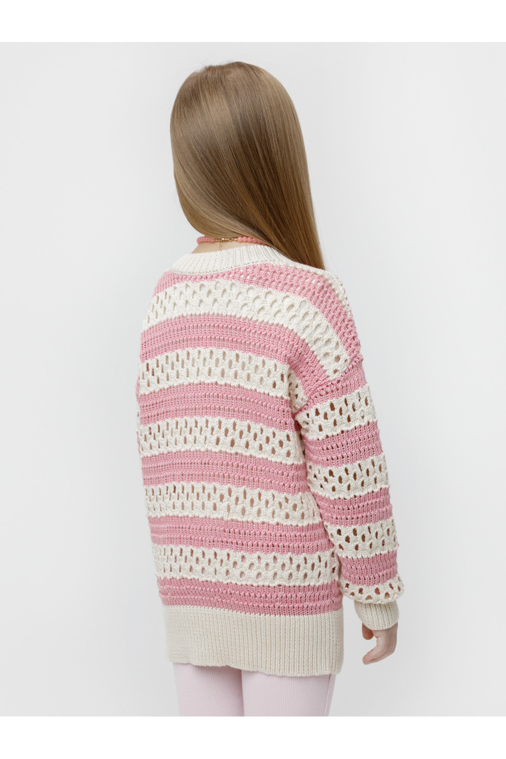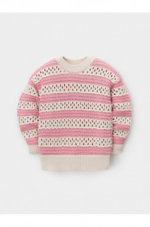 Вязаный джемпер объёмный. Изготовлен из мягкой хлопковой пряжи с добавлением акрила. Длинные рукава с манжетами. Внизу эластичный пояс. Изделие сохраняет форму и стойкий цвет после многочисленных стирок.