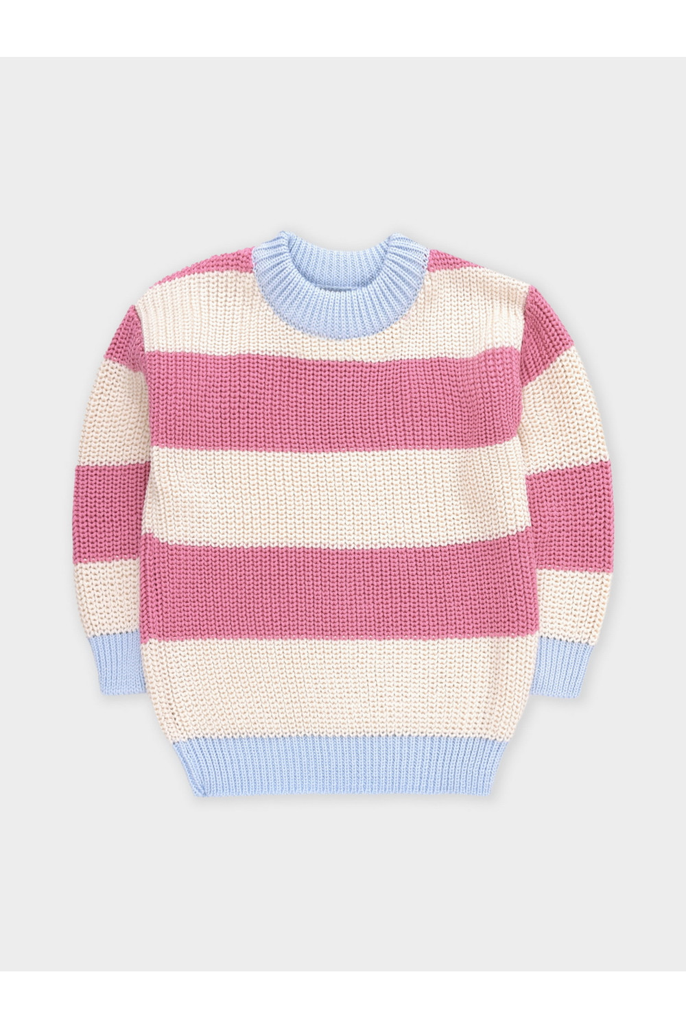 Вязаный джемпер объёмный. Изготовлен из мягкой хлопковой пряжи с добавлением акрила. Длинные рукава с манжетами. Внизу эластичный пояс. Изделие сохраняет форму и стойкий цвет после многочисленных стирок.