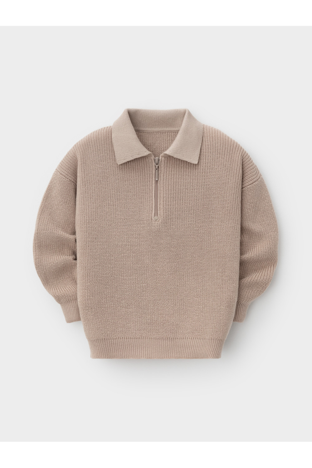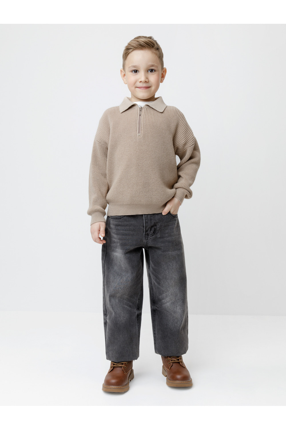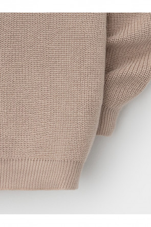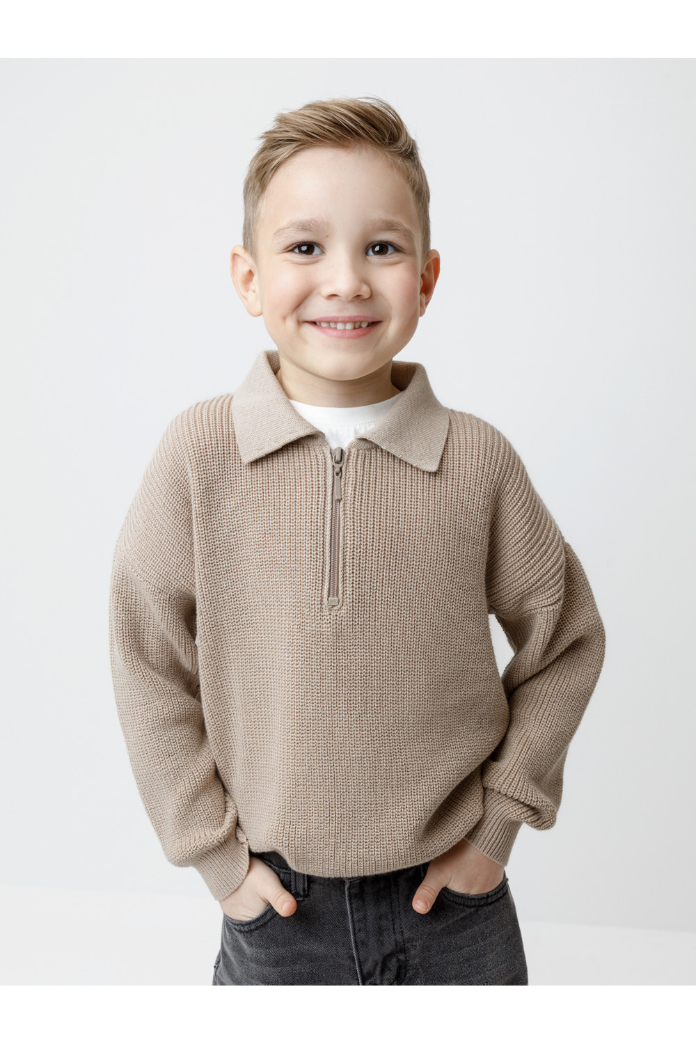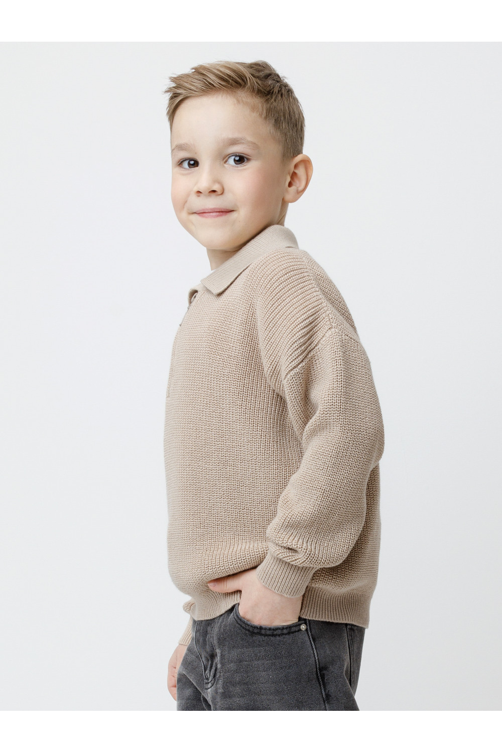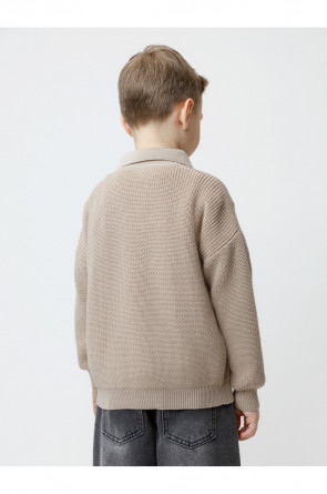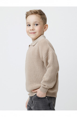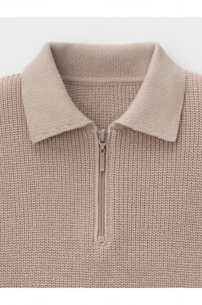 Вязаный джемпер-поло с воротничком и застёжкой на короткую молнию. Изготовлен из мягкой хлопковой пряжи с добавлением акрила. Длинные рукава с манжетами. Внизу эластичный пояс. Изделие сохраняет форму и стойкий цвет после многочисленных стирок.