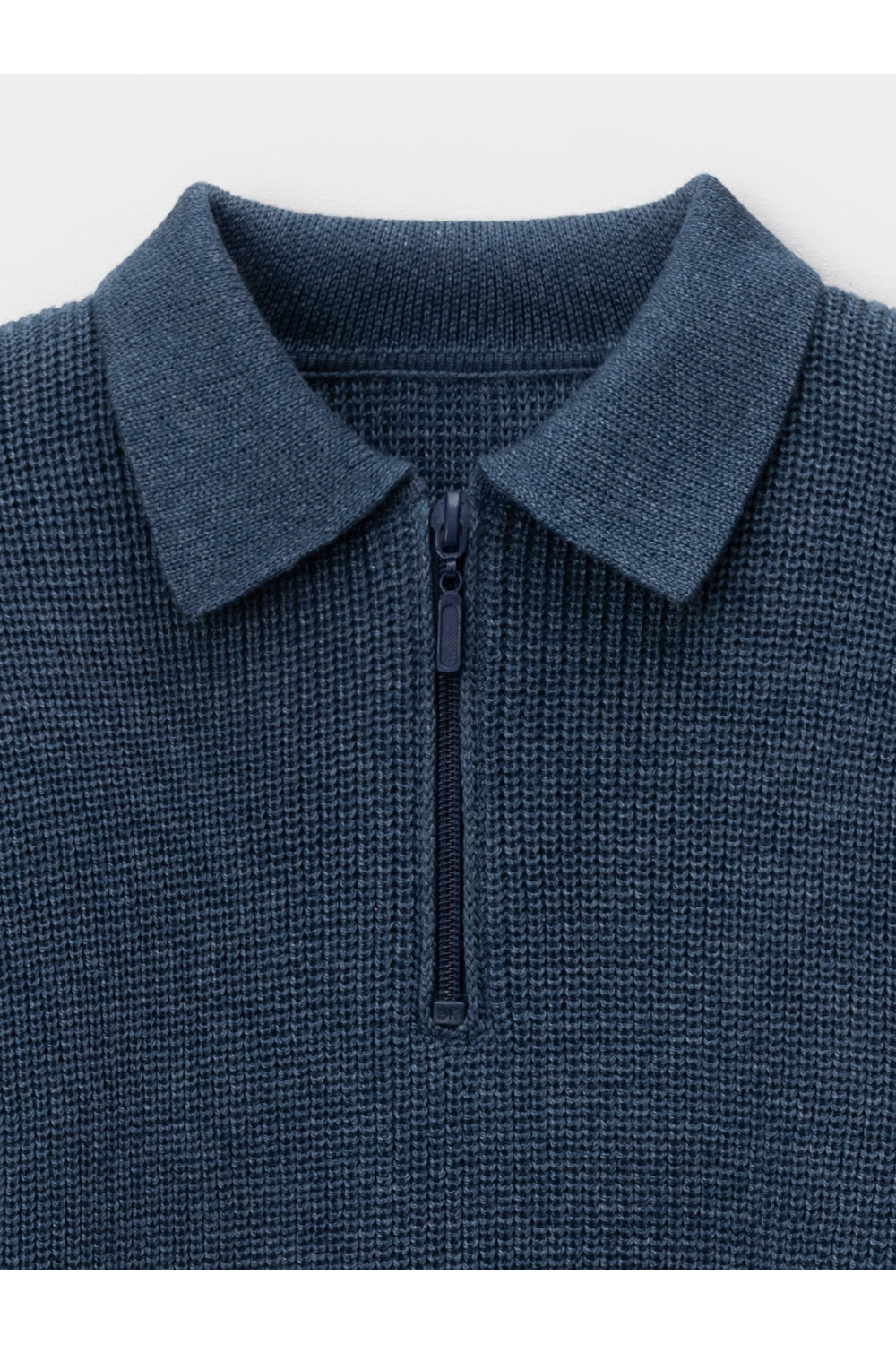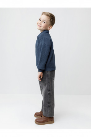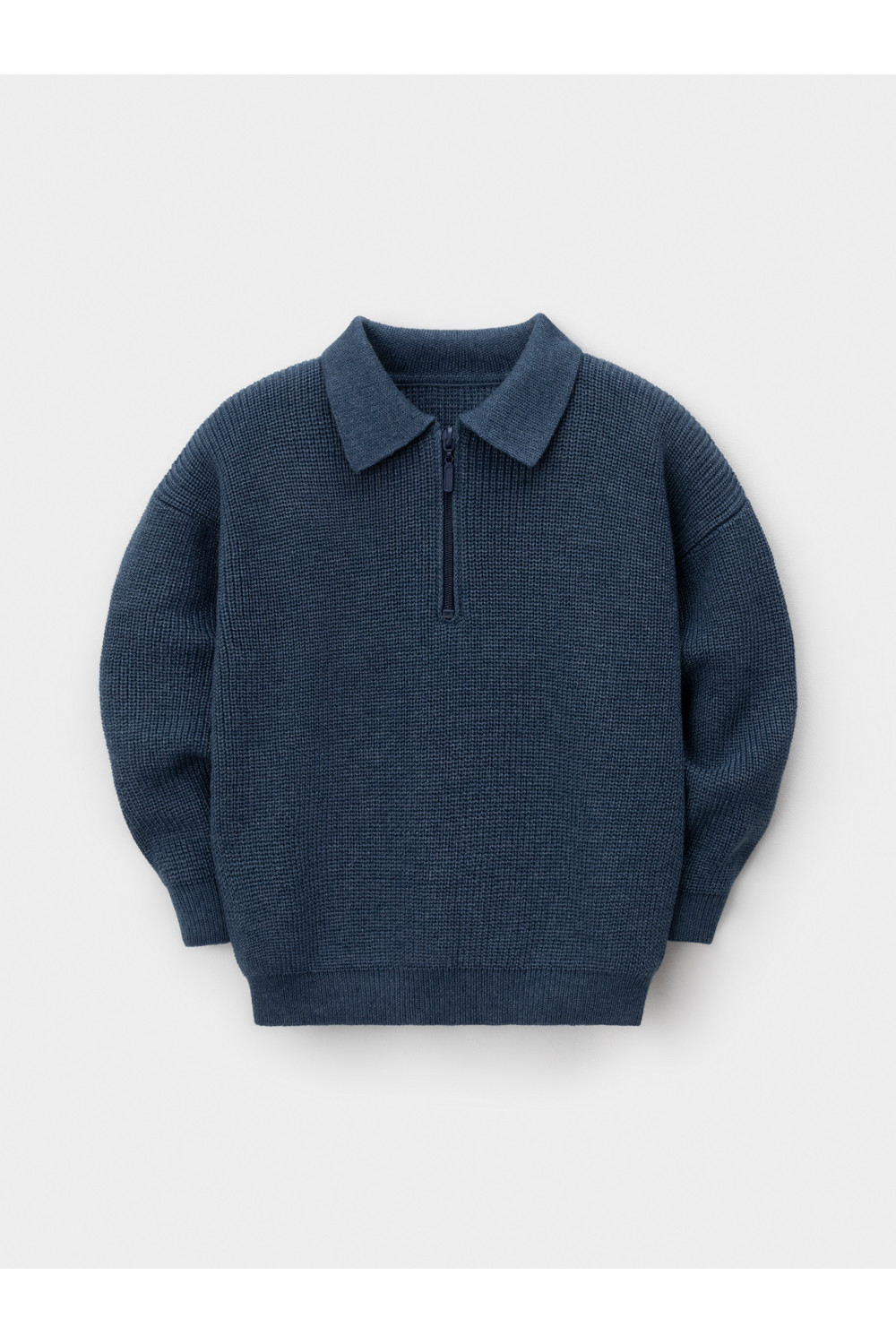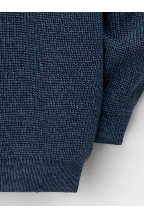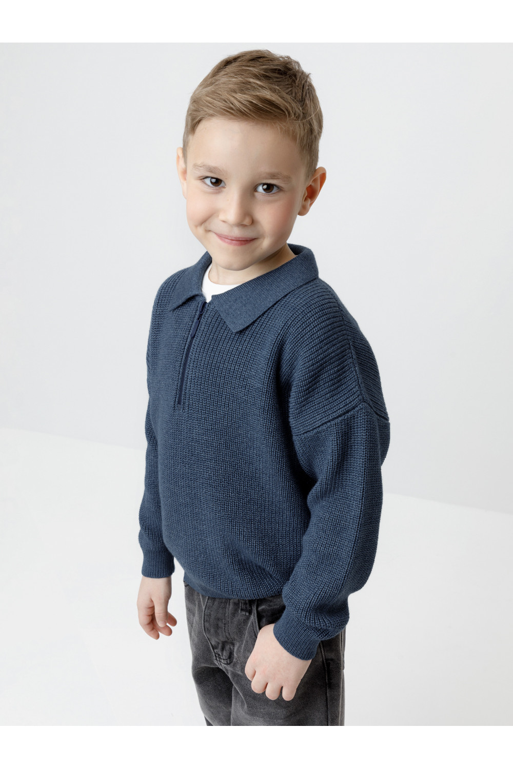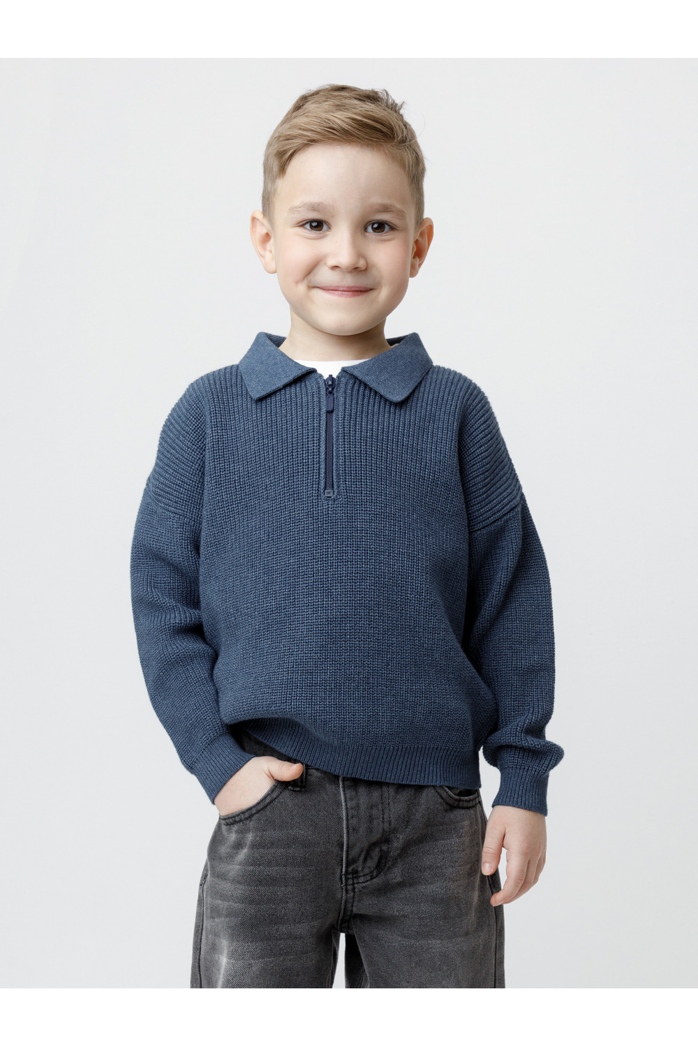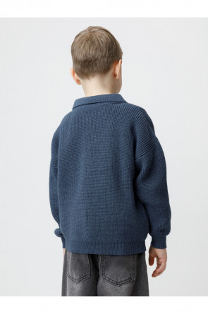 Вязаный джемпер-поло с воротничком и застёжкой на короткую молнию. Изготовлен из мягкой хлопковой пряжи с добавлением акрила. Длинные рукава с манжетами. Внизу эластичный пояс. Изделие сохраняет форму и стойкий цвет после многочисленных стирок.