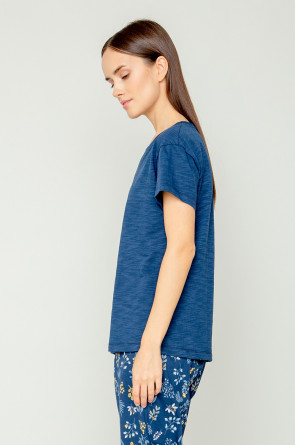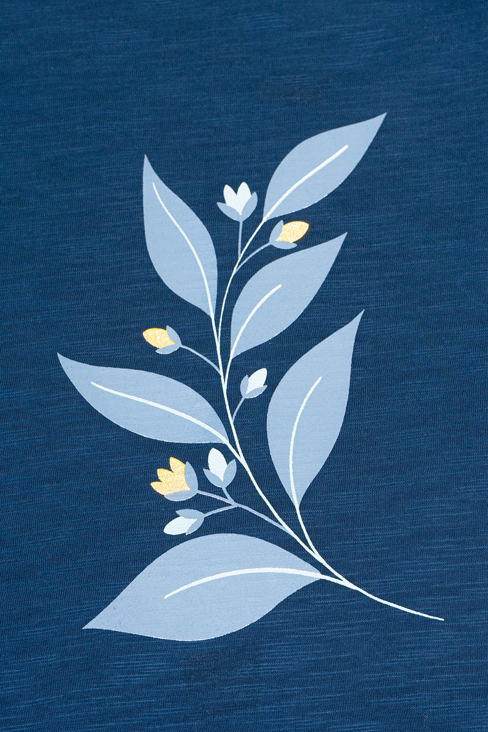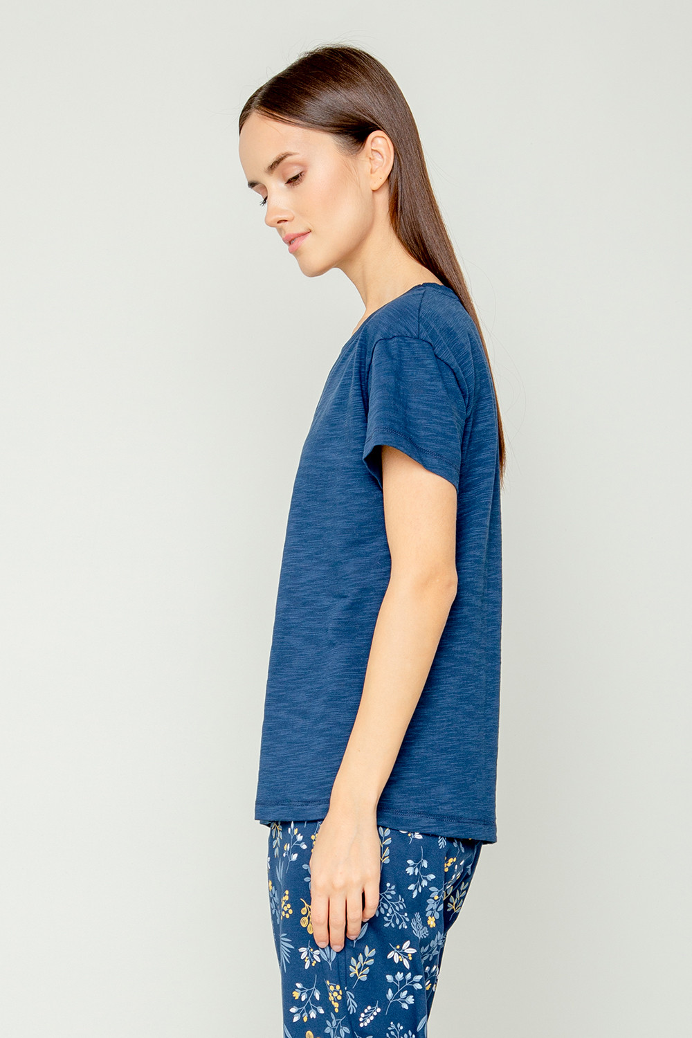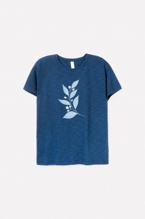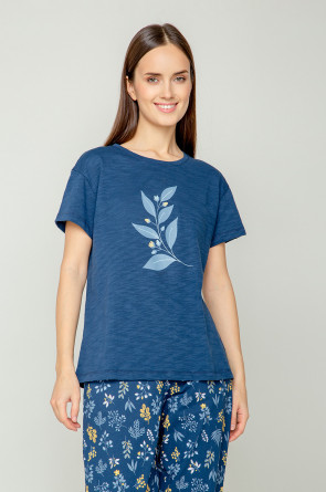 Однотонная футболка с лаконичным принтом. Сшита из лёгкого трикотажа супрем с эффектом слаб. Короткие рукава со спущенной линией плеча создают объём и свободный силуэт.