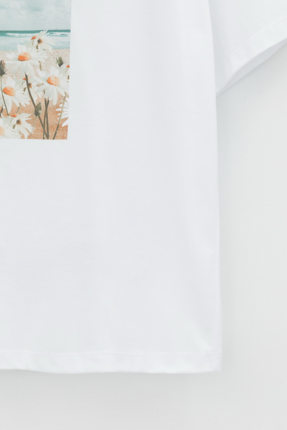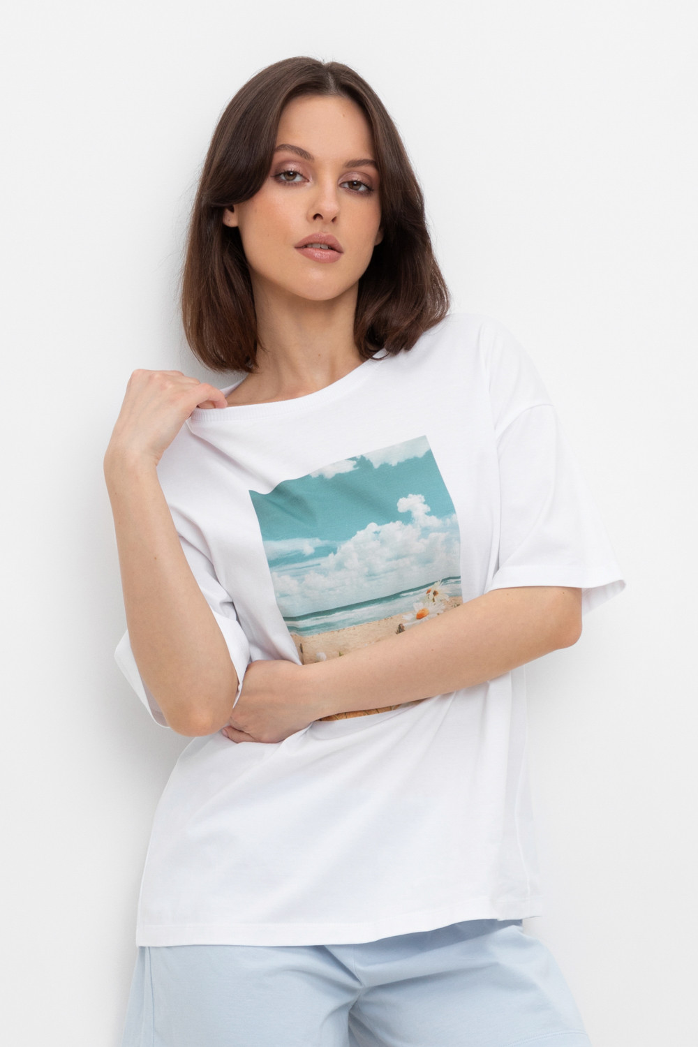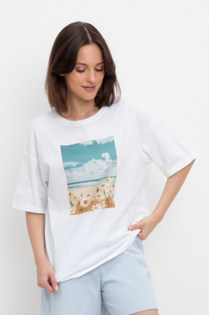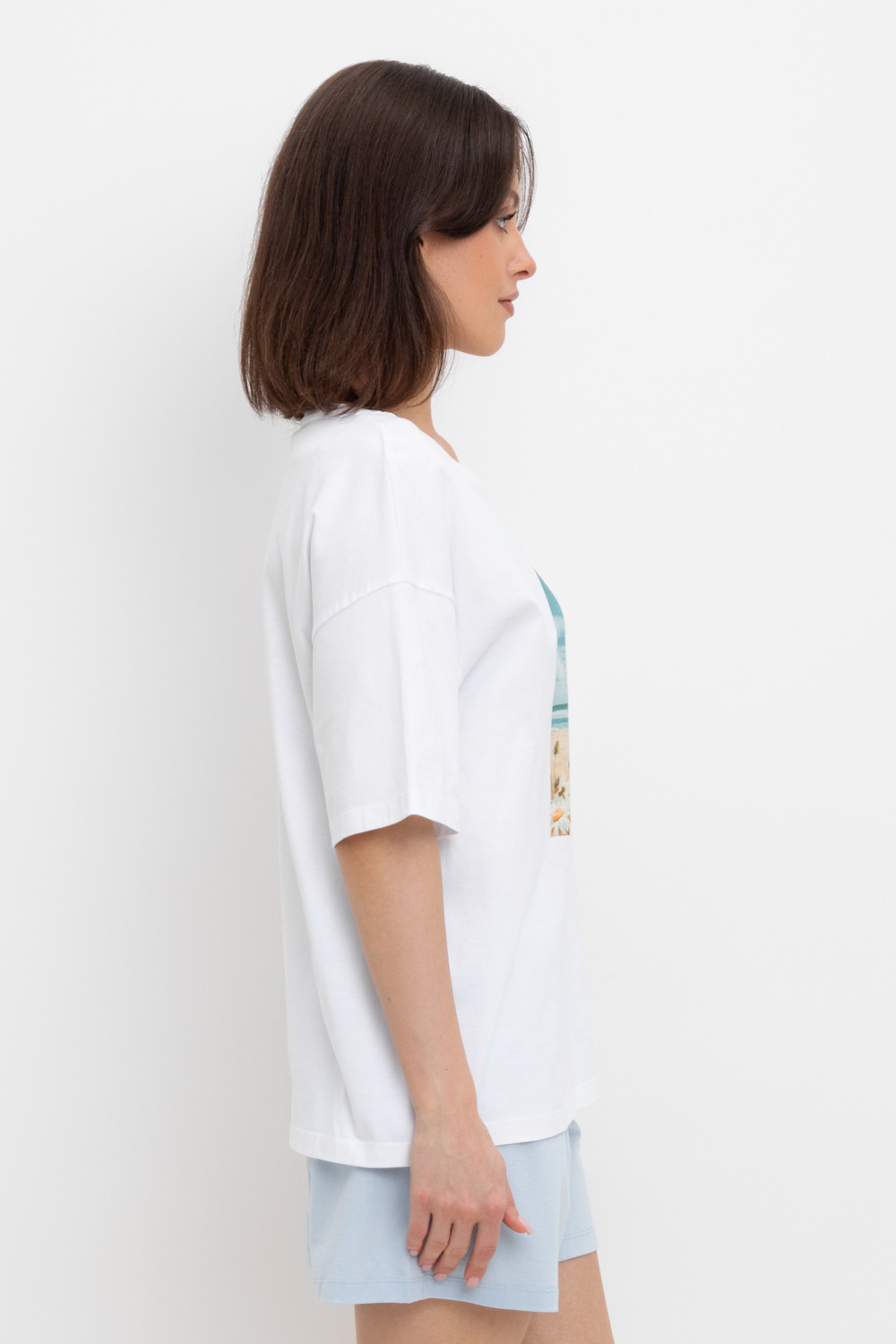 Удлиненная футболка из 100% натурального хлопка. Свободные рукава со спущенной линией плеча создают объём и свободный силуэт. Принт изготовлен из стойких текстильных красителей.