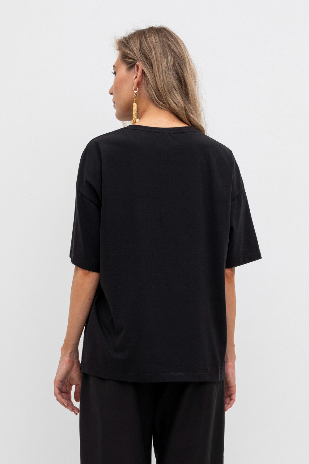 Удлиненная футболка из 100% натурального хлопка. Свободные рукава со спущенной линией плеча создают объём и свободный силуэт. Принт изготовлен из стойких текстильных красителей.